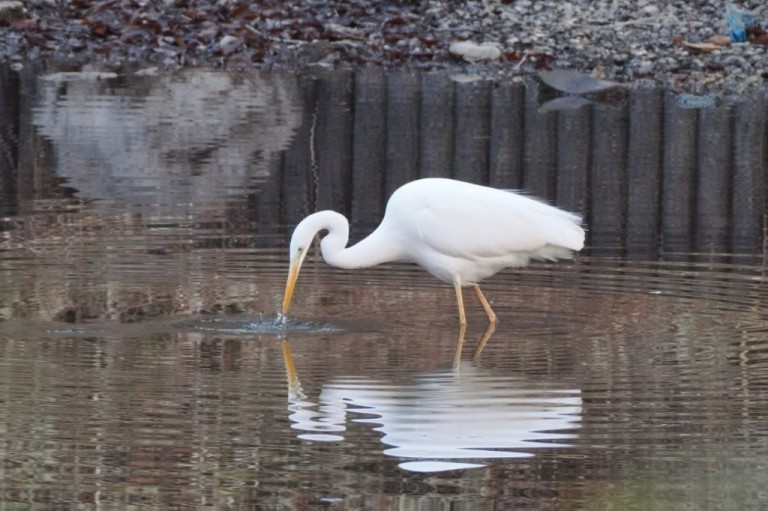 「文学の池」の側を通りかかると、ダイサギが小魚をついばんでいました。池に張った氷が解けたころ合いを見計らって、餌を求めて来たようです。