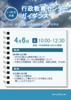 公務員・外交官を検討している2・3年生を対象に、行政教育センターガイダンスを開催します。 詳細は、添付のチラシをご覧ください。 ※同時刻に1年生向けのガイダンスを他教室で行っています。会場をお間違えないようご注意ください。
