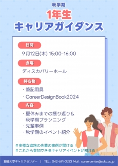 秋のオリエンテーション期間に、1年生キャリアガイダンスを開催いたします。「夏休みまでの振り返り &秋学期プランニング」につて一緒に考えていきたいと思います。奮ってのご参加をお待ちしています。 ■主な内容 ・夏休みまでの振り返り &秋学期プランニング ・先輩事例 ・秋学期のイベント紹介 ■持ち物 ・筆記用具 ・キャリアデザインブック2024
