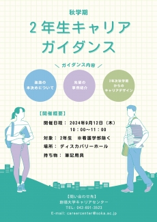 2年生を対象にキャリアガイダンスを開催します! 希望進路とSOKA Generic Skillを振り返りながら、2年生秋学期の大学生活をどのようなものにするか、一緒に描いていきましょう。先輩の事例もとても参考になります。奮ってのご参加をお待ちしています。