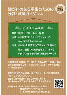 2026年3月卒予定の学部生・大学院生で 障がい者枠での就職を考えている方を対象に、ガイダンスを開催します。