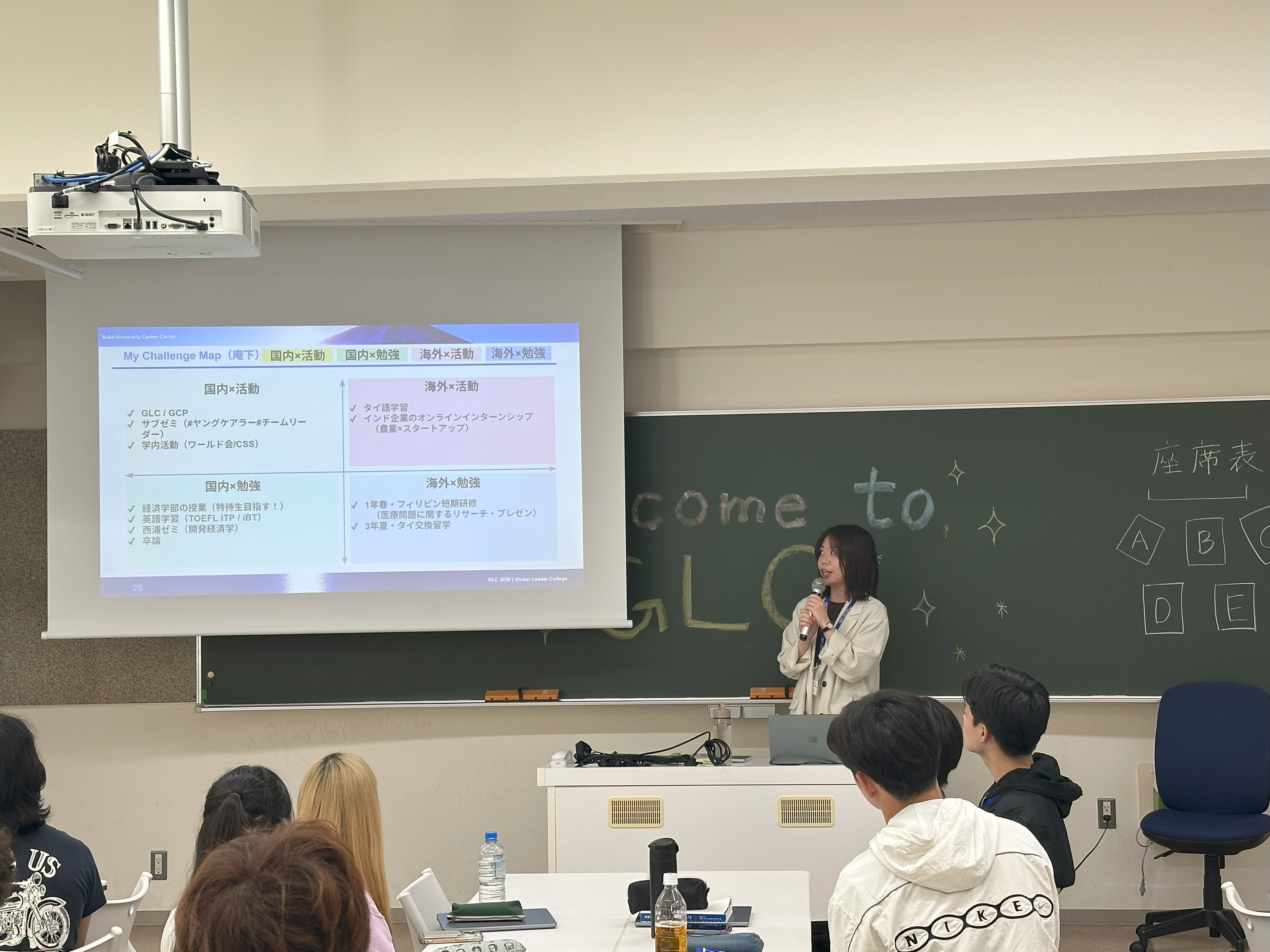 開講式では、まず卒業生スタッフによる挨拶の後、プログラム概要の説明と4年生のメンタースタッフの自己紹介、GLCでの挑戦を報告するプレゼンテーションが行われました。続いて、GLCプログラムの立ち上げを支えてきた卒業生スタッフから、世界を見続ける学びの意義と挑戦へのエールが送られました。