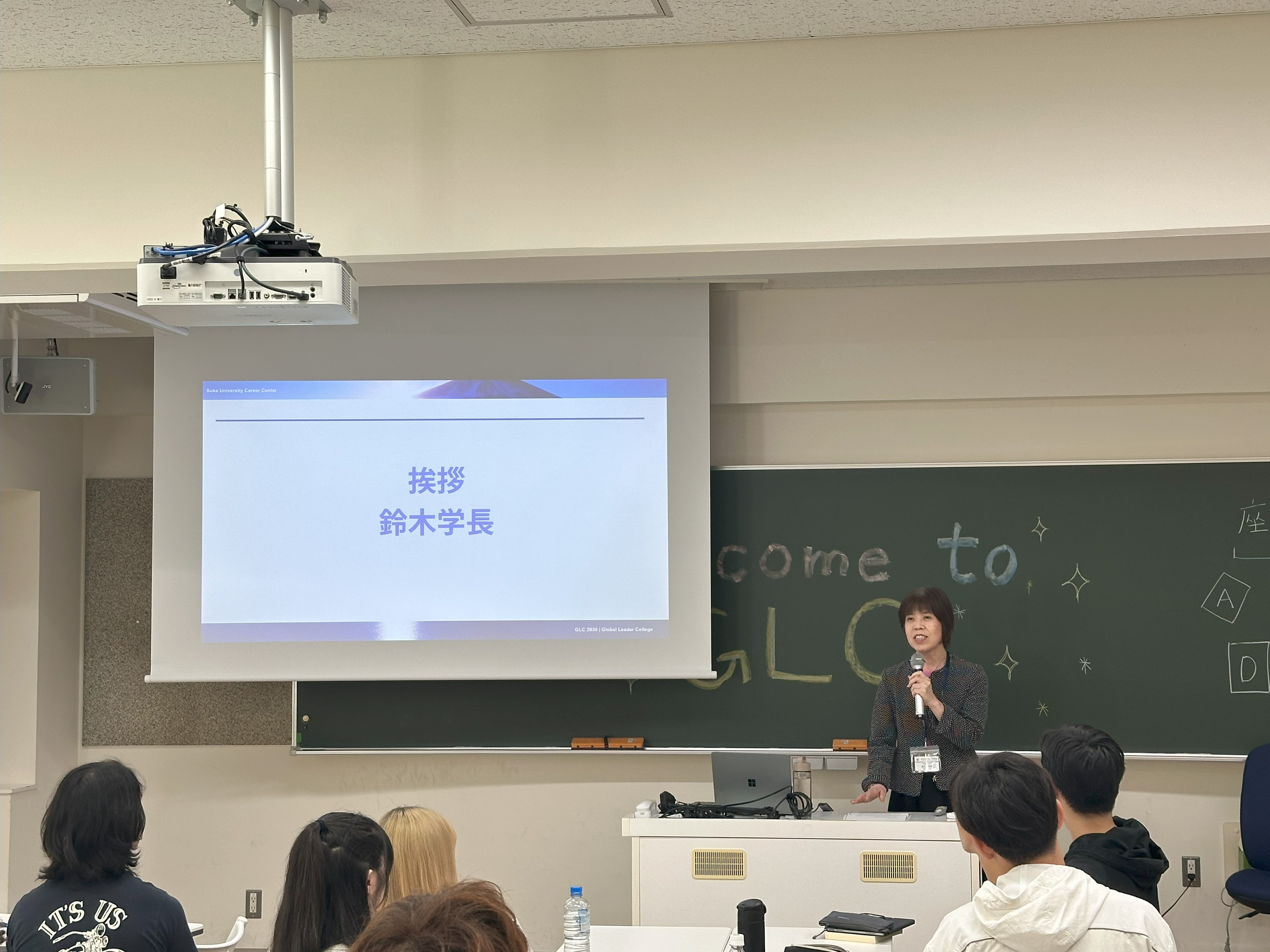 最後に登壇した鈴木美華学長は、学生時代の原点や海外での経験を踏まえ、「創価大学を世界一の大学にしていく使命と責任を胸に、GLCで学びの日々を送ってほしい」と期待を寄せられました。