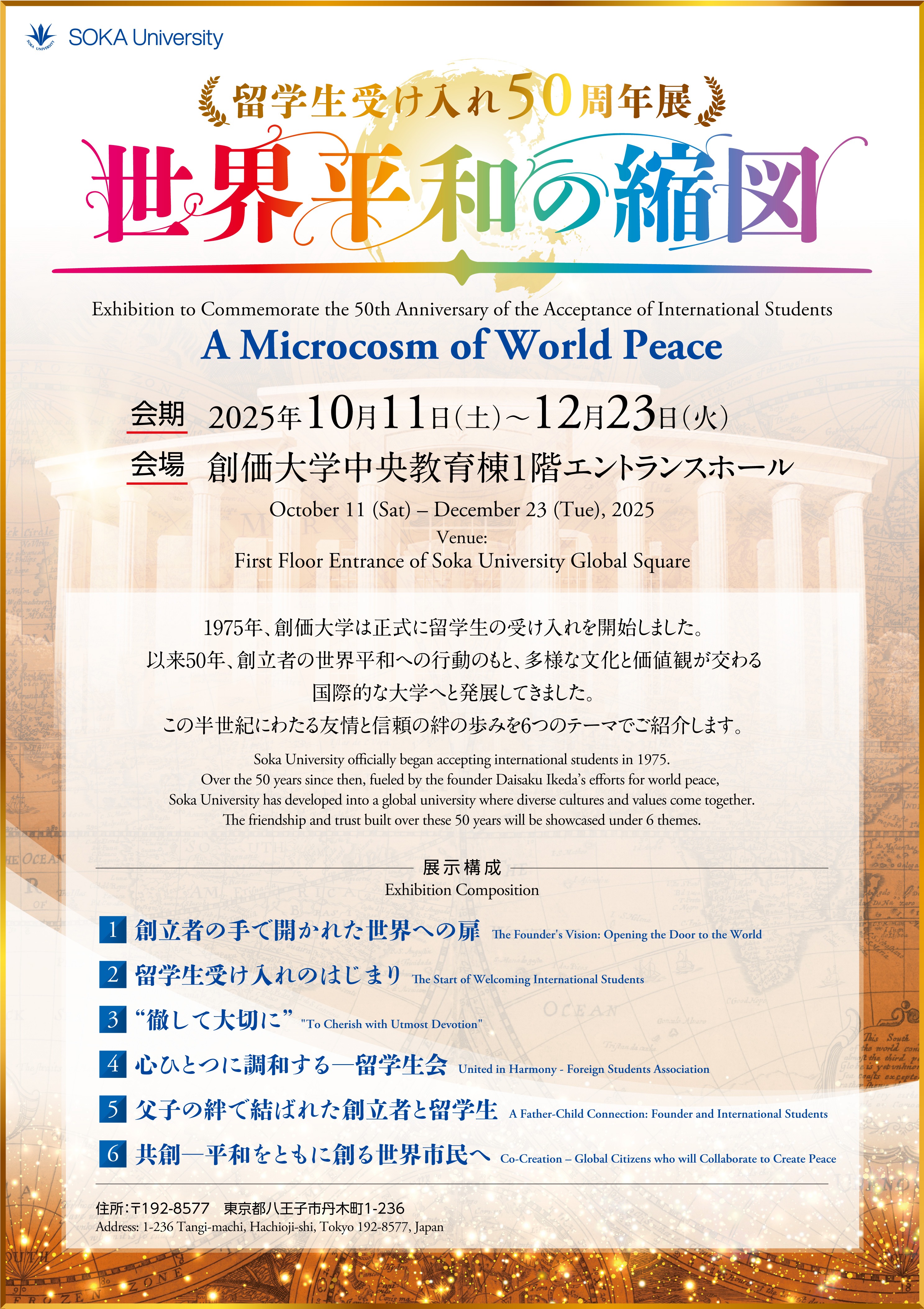 Soka University has developed into a global university where diverse cultures and values come together. The friendship and trust built over these 50 years will be showcased under 6 themes.
