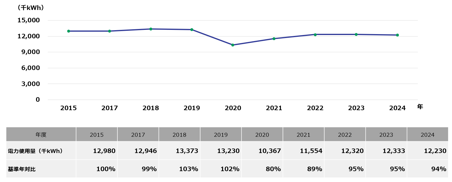 2024年度の電力使用量は2015年度比で6%減に留まり、より積極的な削減対策を検討し実施していきます。