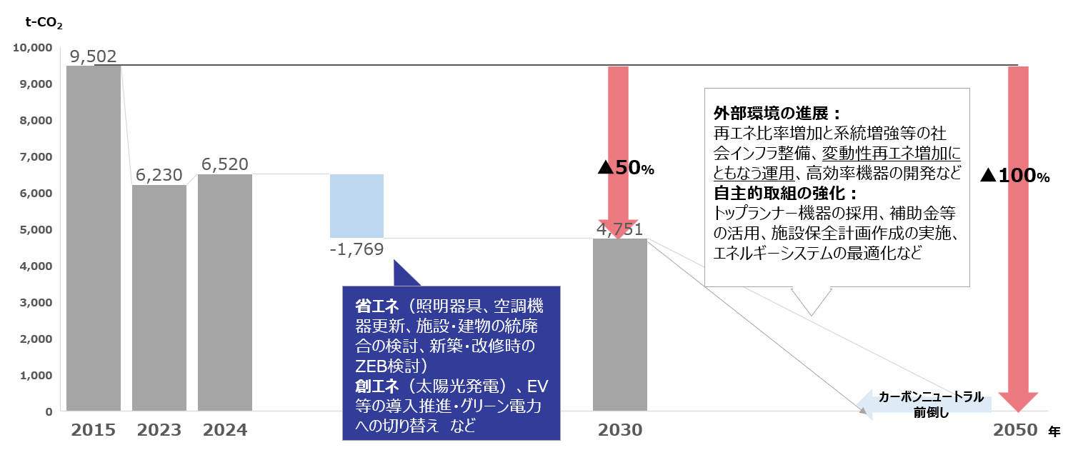 2031年度以降に関しては外部環境の進展を踏まえ、自主的取り組みを強化し、カーボンニュートラル達成の前倒しを図ります。