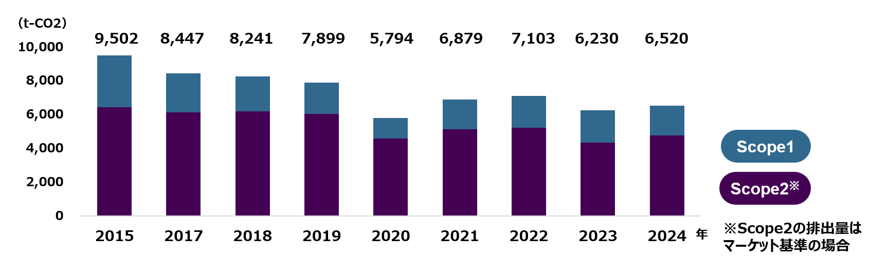 2024年度は前年度比で電力使用量は減少しましたが、電力排出係数が増加したことからScope2が10%増加しています。