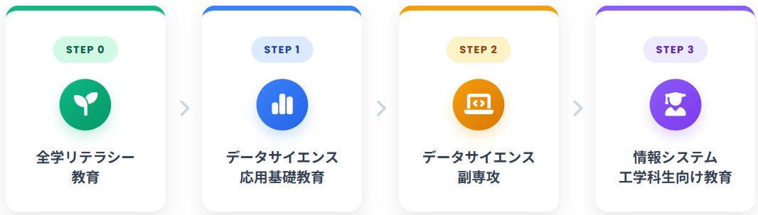 STEP2「データサイエンス副専攻」の中核をなす必修・選択必修科目から構成されており、各学科の指定する「データサイエンス活用演習*1」科目では、自身の学問分野におけるデータサイエンスの活用を学び、実践していく力を養成しています。