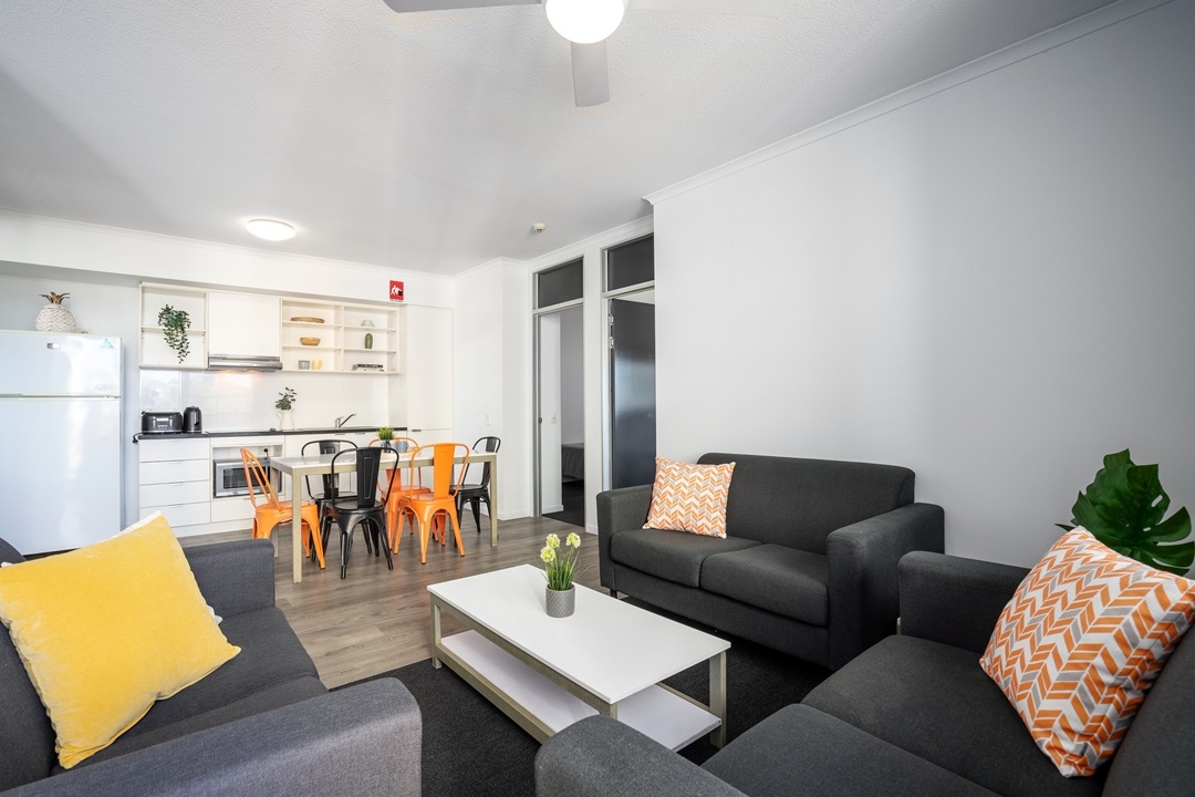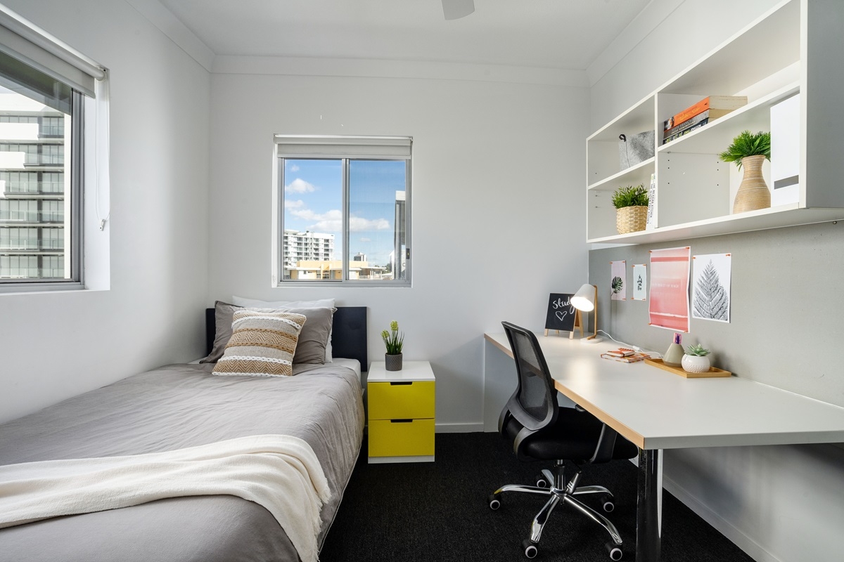 各学生に机とベッドが備わった個室が用意され、ハウスメイトとリビングを共有します。プライバシーを確保しながら、ハウスメイトとの交流もできる環境です。Diploma Unitの学生については、すぐ向かいにQUTのKelvin Campusがあるという好立地。Degree Unitの学生が通うGardens Point Campusには、Igluのすぐ前から無料のシャトルバスが出ています。