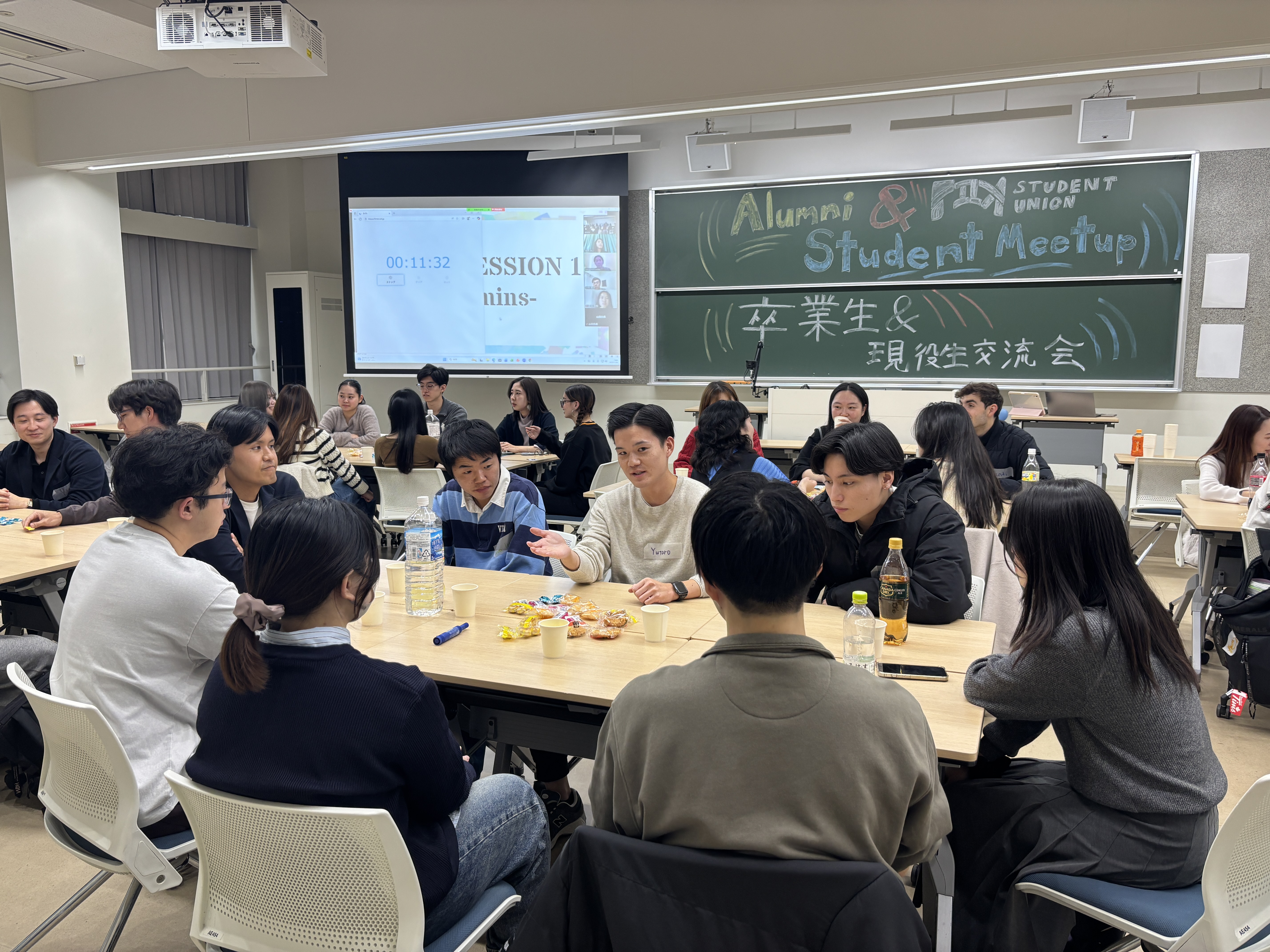 11月29日、国際教養学部卒業生・現役生交流会が開催されました。今回のイベントは、国際教養学部卒業生で構成されるFILA Alumni Associationと学生自治会が合同で企画したもので、対面・オンライン合わせて13名の卒業生にご参加いただきました。学部長メッセージ、主催者挨拶、卒業生の自己紹介の後、自由懇談会が行われ、就職活動、大学院進学、英語学習や日々の課題への姿勢等、現役生から具体的な質問・相談が寄せられ、有意義な時間となりました。