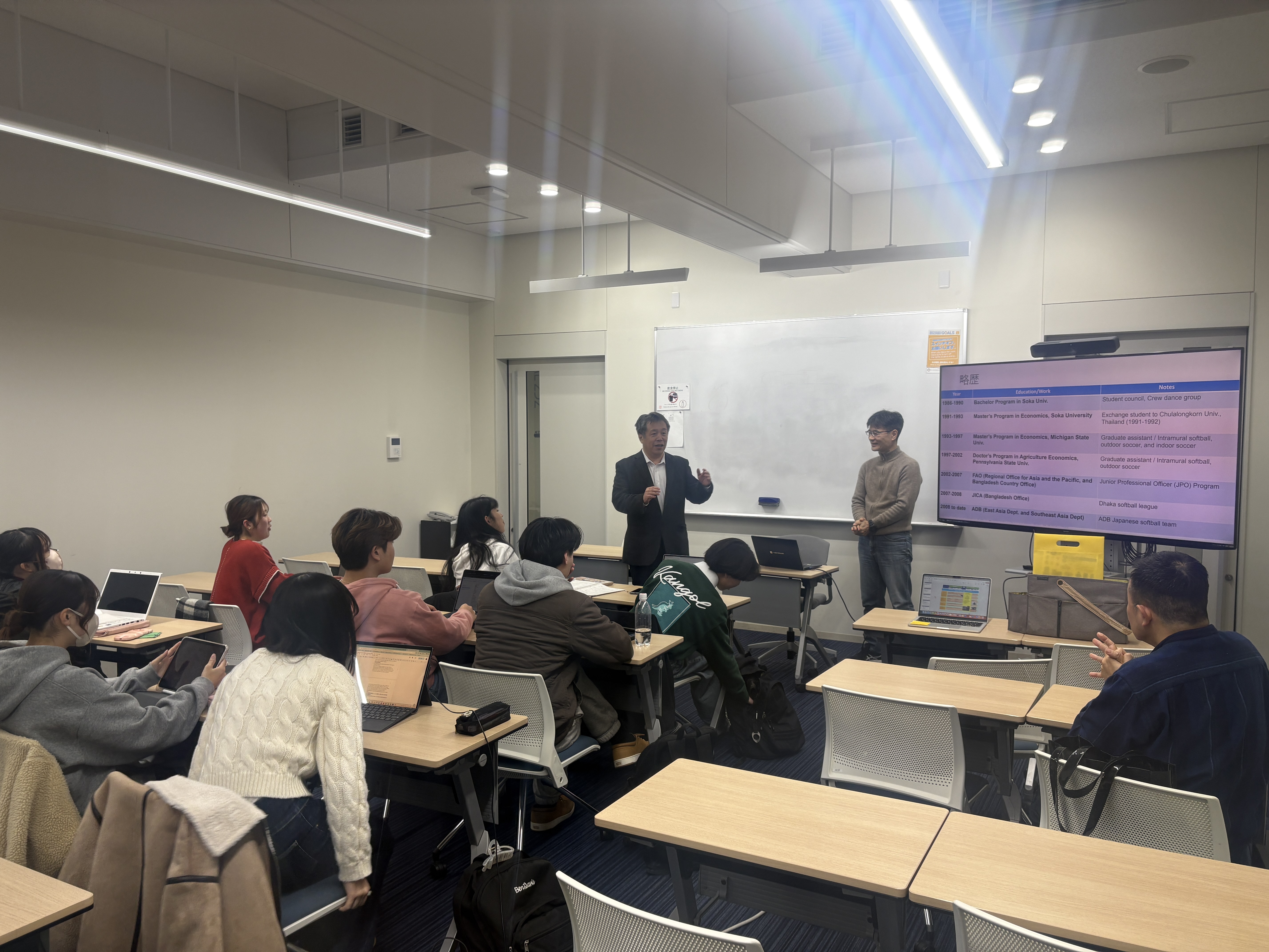 12月17日(水)、「International Fieldwork I」の授業において、本学卒業生で現在アジア開発銀行(ADB)に勤務されている上田氏をお招きし、ご講演いただきました。当日は、これまでのご経歴や学生時代の取り組み、創立者との出会いなどについてお話しいただき、学生たちは熱心に耳を傾けていました。