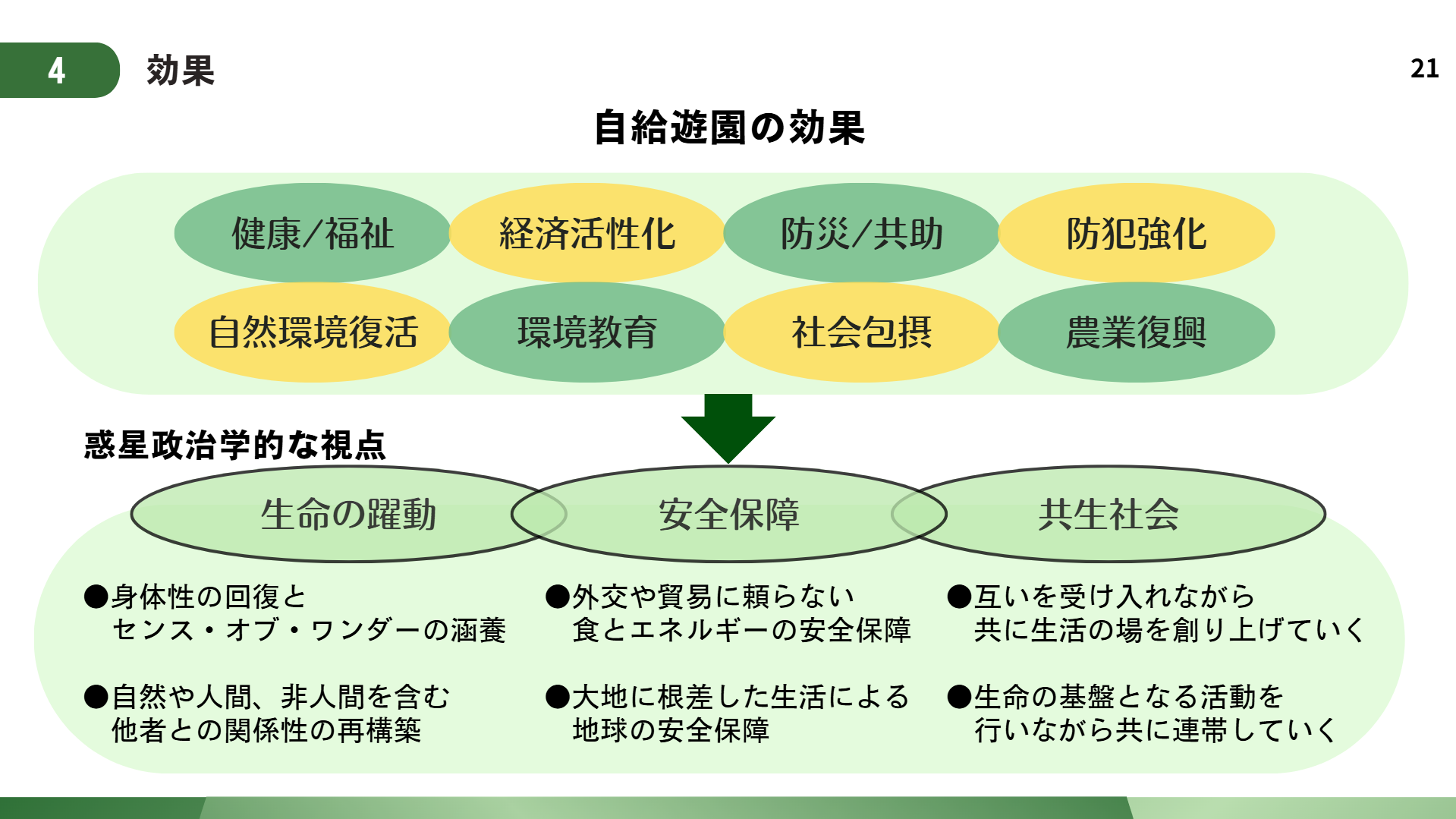 2. 「自給遊園」による地域循環型社会の創出:農業人口の減少や食料自給率の低下といった課題に対し、都市公園や耕作放棄地を、遊びながら自給し学べる多機能な場「自給遊園」として再生する提案を行いました。