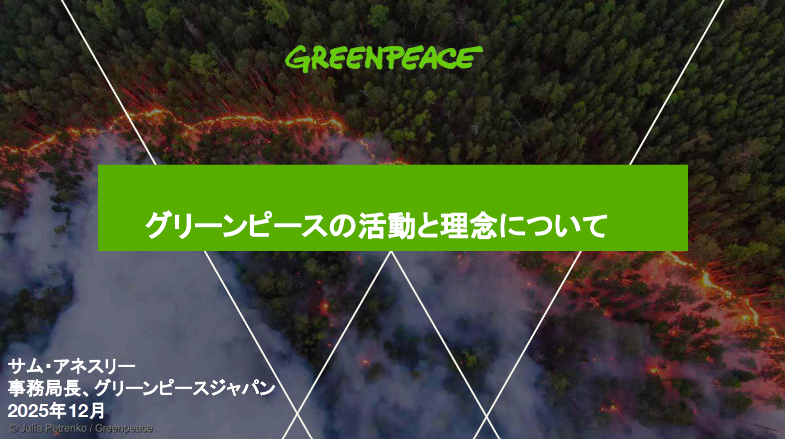 講演の冒頭でアネスリー氏は、グリーンピースの歴史と理念について説明されました。1971年、核実験を阻止するために実験予定地へ船で向かった若者たちの行動がグリーンピースの原点であり、そこから地球規模での環境保護と平和の実現を使命として活動が広がっていったことが紹介されました。現在グリーンピースは、気候変動、生物多様性の喪失、汚染や廃棄物の問題を主要な課題として掲げ、各国政府や企業から独立し、個人からの寄付のみを資金源として活動を行っています。