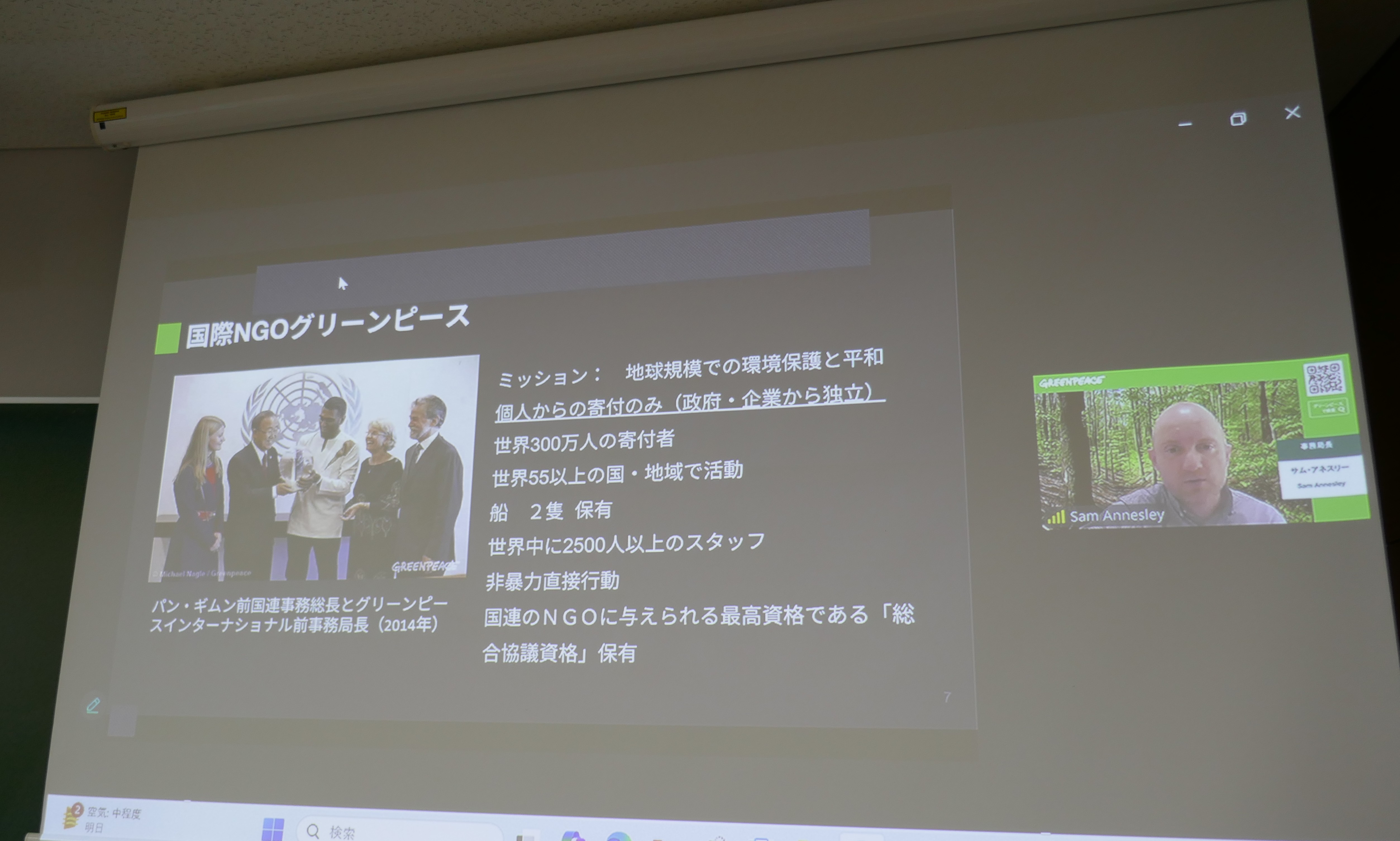 2025年12月10日、法学部地球平和共生コースの「地球平和共生ワークショップ」において、国際環境NGOグリーンピース・ジャパン事務局長のサム・アネスリー氏を講師に迎え、「グリーンピースの活動と理念について」と題した講演が行われました。