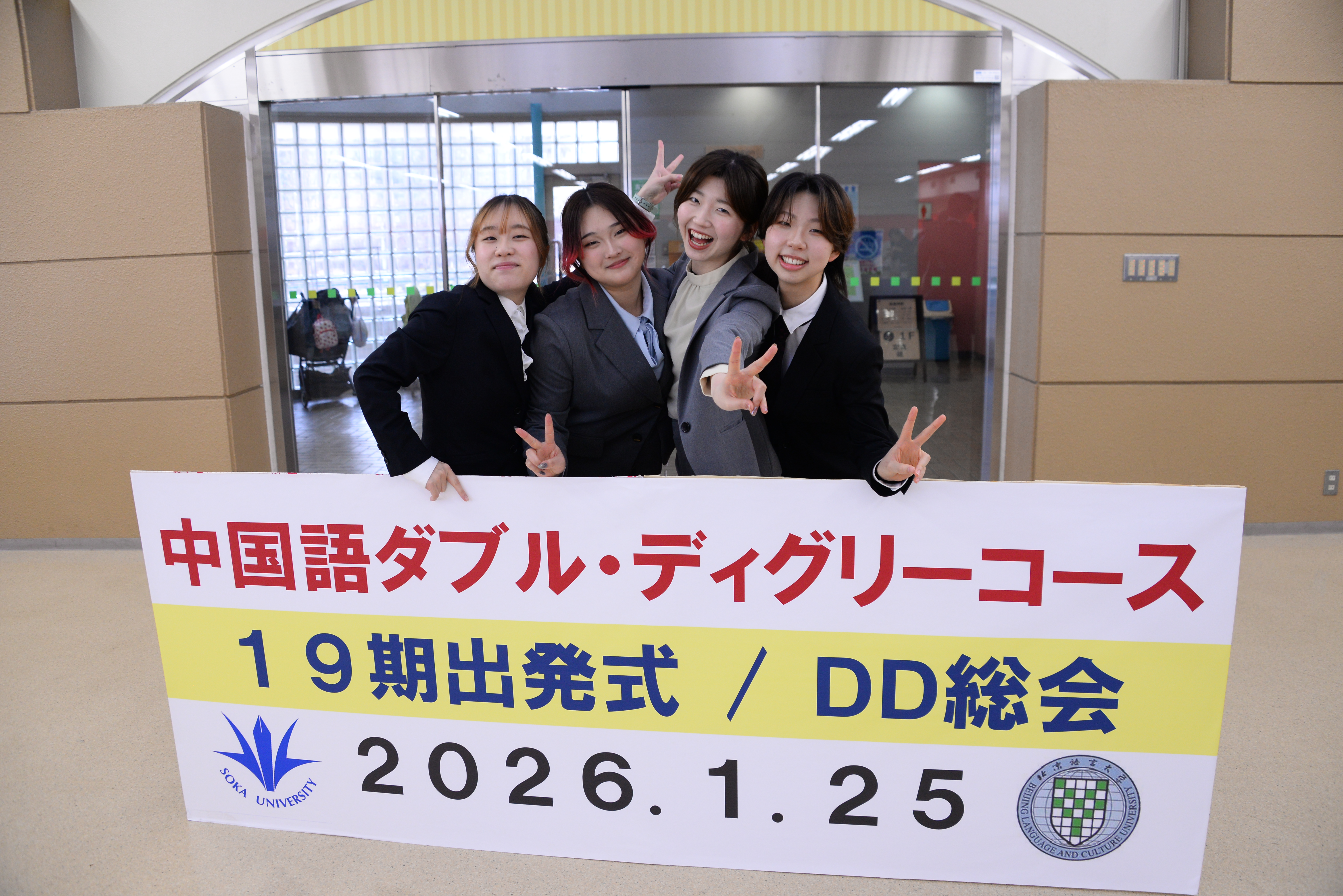 2026年1月25日、中国語ダブル・ディグリー(DD)総会および19期生の留学出発式を行いました。 当日は120名を超える卒業生が参加し、さらに北京・上海ともオンラインでつなぎ、会場と海外が一体となる盛大な式典となりました。 秋谷理事長、鈴木学長をはじめ多くの教職員から19期生へ温かい激励のメッセージが送られ、最後には19期生一人ひとりが中国留学への力強い決意を表明。 会場は大きな拍手とエールに包まれました。 2026年2月27日から、いよいよ中国語DD最後の派遣学生として19期生の2年間の中国留学がスタートします!