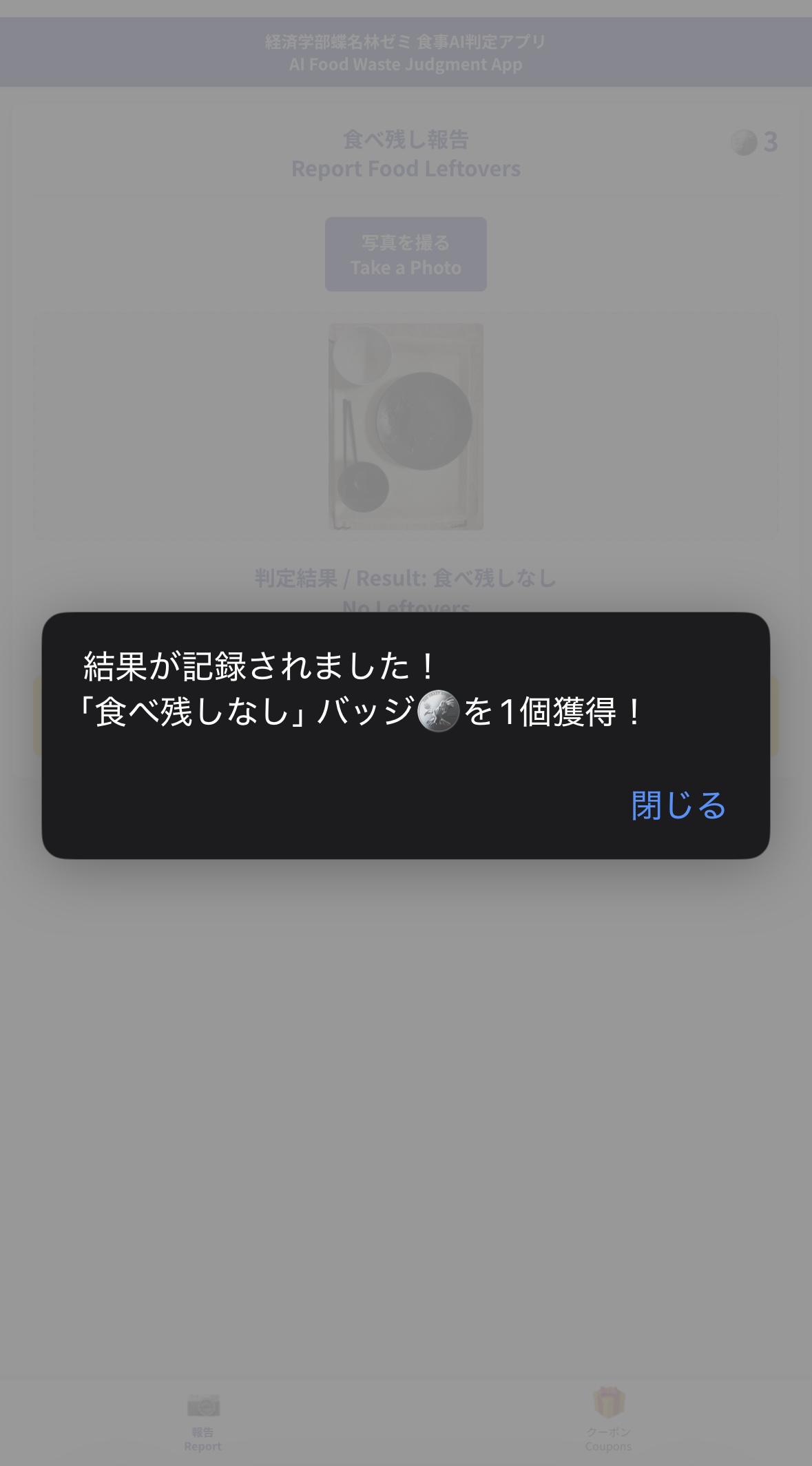 11月5日から13日までのアプリ延べ利用者数は153名となり、導入直後としては多くの学生・教職員が活用していることが分かります。アプリ利用者を対象とした事前アンケートでは、約8割が「食べ残しをしないように意識が高まった」と回答しました。これらの結果は、AIによる即時フィードバックと特典によるインセンティブが、食べ残し削減に向けた行動変容を促す有望な手法であることを示唆しています。