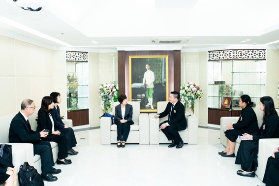 その後、本年で交流10周年を迎えたパニャピワット経営大学を訪問し、ソンポップ学長、ポーンヴィット副学長等と会見しました。短期インターンシッププログラムの成果を振り返るとともに、今後のさらなる交流等について語り合いました。