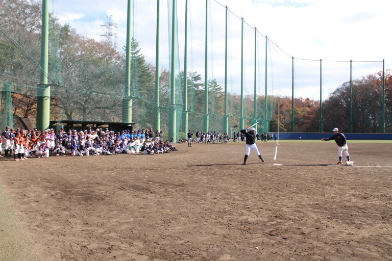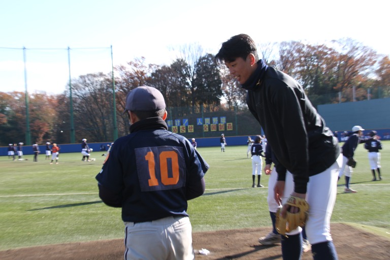 野球教室では、鬼ごっことキャッチボールでウォーミングアップをした後、それぞれのポジションにわかれ、ティーバッティング、ピッチング、内野・外野の守備など、約2時間にわたって練習が行われました。各練習では一生懸命に取り組む児童一人ひとりに対し、硬式野球部員が「ナイスボール!」「ナイスプレー!」と声をかけたり、フォームをアドバイスする場面が見られました。また10月23日に開催されたプロ野球ドラフト会議にて東京ヤクルトスワローズから3位指名を受けた山崎太陽投手も参加し、最後に野球部員によるホームランのデモンストレーションが行われ、児童たちは食い入るように真剣に見つめ、野球部員のプレーに歓声があがりました。