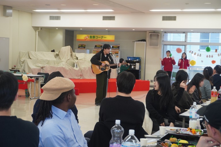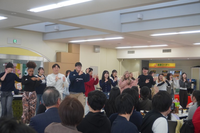 はじめに鈴木美華学長が、新年のお祝いとともに、留学生の日々の努力を讃える挨拶を述べました。歓談の時間には、留学生代表による演目やくじ引き大会などが行われ、賑やかに新年を祝いました。また、各テーブルでは、自国の新年の過ごし方を紹介する様子が見られるなど、国際色豊かな交流のひとときとなりました。