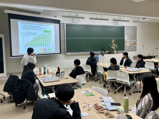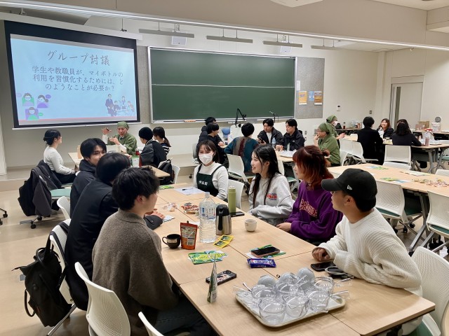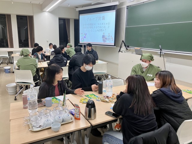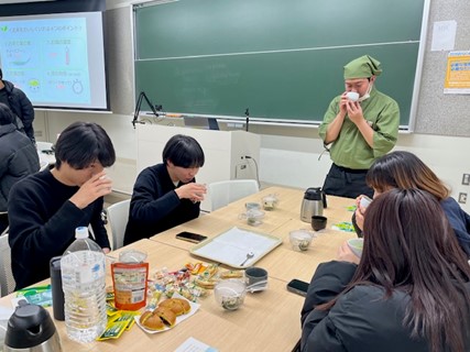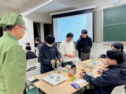 続いて、株式会社伊藤園より、茶殻を再利用したリサイクル製品や茶産地育成事業など、同社のサステナビリティへの取り組みが紹介されました。参加者は企業と学生それぞれの視点から資源循環の現状を学び、その後、「学内でのマイボトル利用を推進するための工夫」について活発な意見交換を行いました。また、伊藤園のティーテイスターから「美味しいお茶のいれ方」のレクチャーを受け、全員で実践。本格的なお茶の香りを楽しみながらの親睦のひとときとなりました。