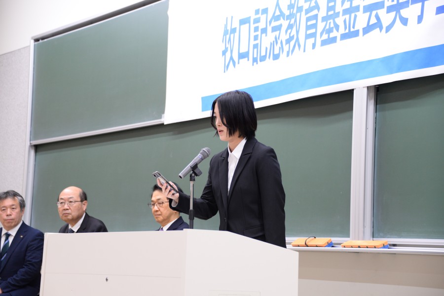 その後、牧口記念教育基金会の岡部高弘理事長が、「牧口先生、戸田先生、池田先生の想いを受け継ぎ、分断が起こる世界において、創立者の心をわが心として、人類の幸福に貢献できる力を付けて成長してください。充実した留学生活となることを願っています」と述べ、学生代表に奨学生証書が授与されました。