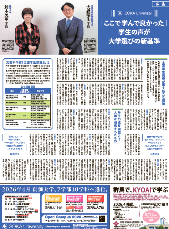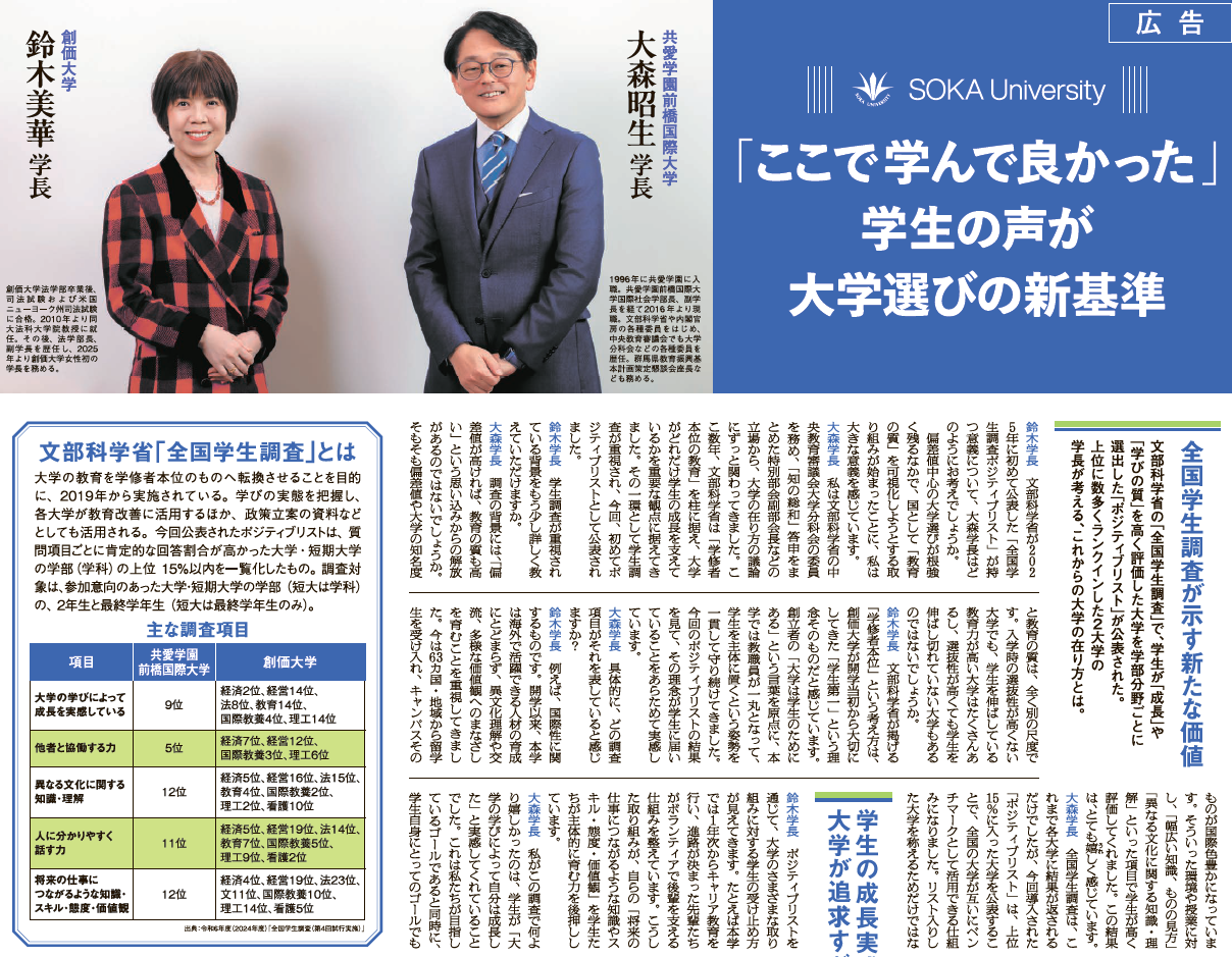 この結果を踏まえ、本学と同様に高い評価を得た共愛学園前橋国際大学の大森昭生学長と、本学の鈴木美華学長による対談を実施しました。「全国学生調査」をテーマに、偏差値や知名度とは異なる「大学選びの新しい基準」としての期待や、両大学の教育活動の成果や特色等について語り合っています。対談の様子は、以下の新聞各紙広告に掲載されました。