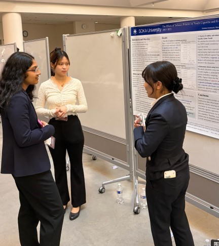 NCRCは、世界各国の大学から選抜された学生が集う、米国最大級の学術会議です。蝶名林ゼミのチームは「The Effects of Tobacco Policies on Youth Cigarette and E-Cigarette Use, 2015–2023(タバコ政策が若年層の紙巻き・電子タバコ利用に与える影響)」というテーマでポスター発表しました。近年の政策変更が若者の健康行動にどのような効果をもたらしたかを経済学的な視点から報告しました。