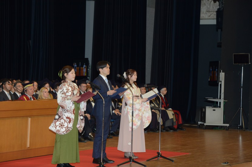 また、大学院のダブル・ディグリープログラム修了者にスペイン・バリャドリード大学大学院の「修士」、文学部のダブル・ディグリーコースの修了者に中国・北京言語大学と英国・バッキンガム大学の「学士」が贈られました。