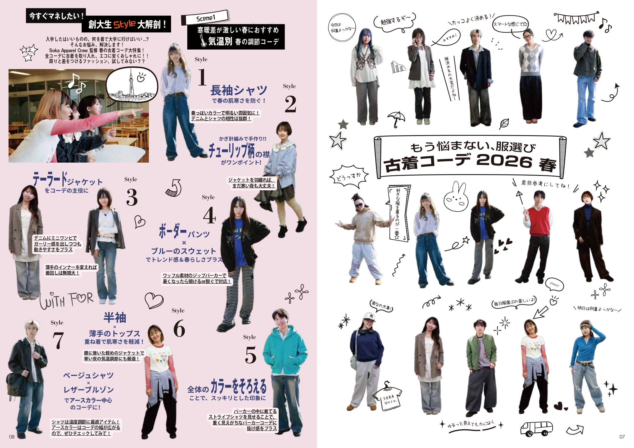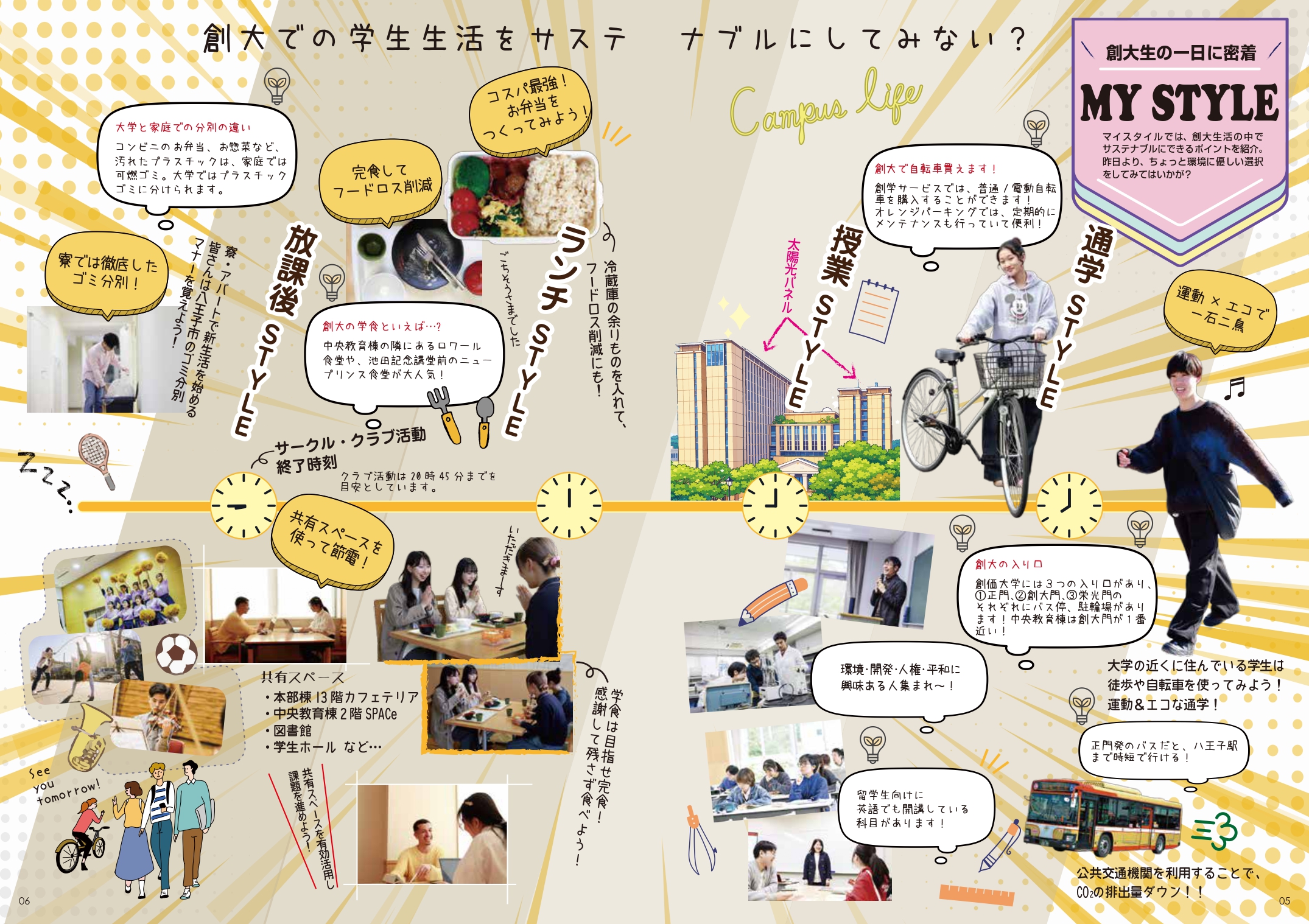 学生の一日に密着し、サステナブルに生活するためのポイントを紹介する「MY STYLE」や、古着を用いた春コーデの紹介ページ、創大生が選ぶエコアイテムを紹介する「My Eco Item」など、学生にとって関心のあるテーマが多数収録されています。
