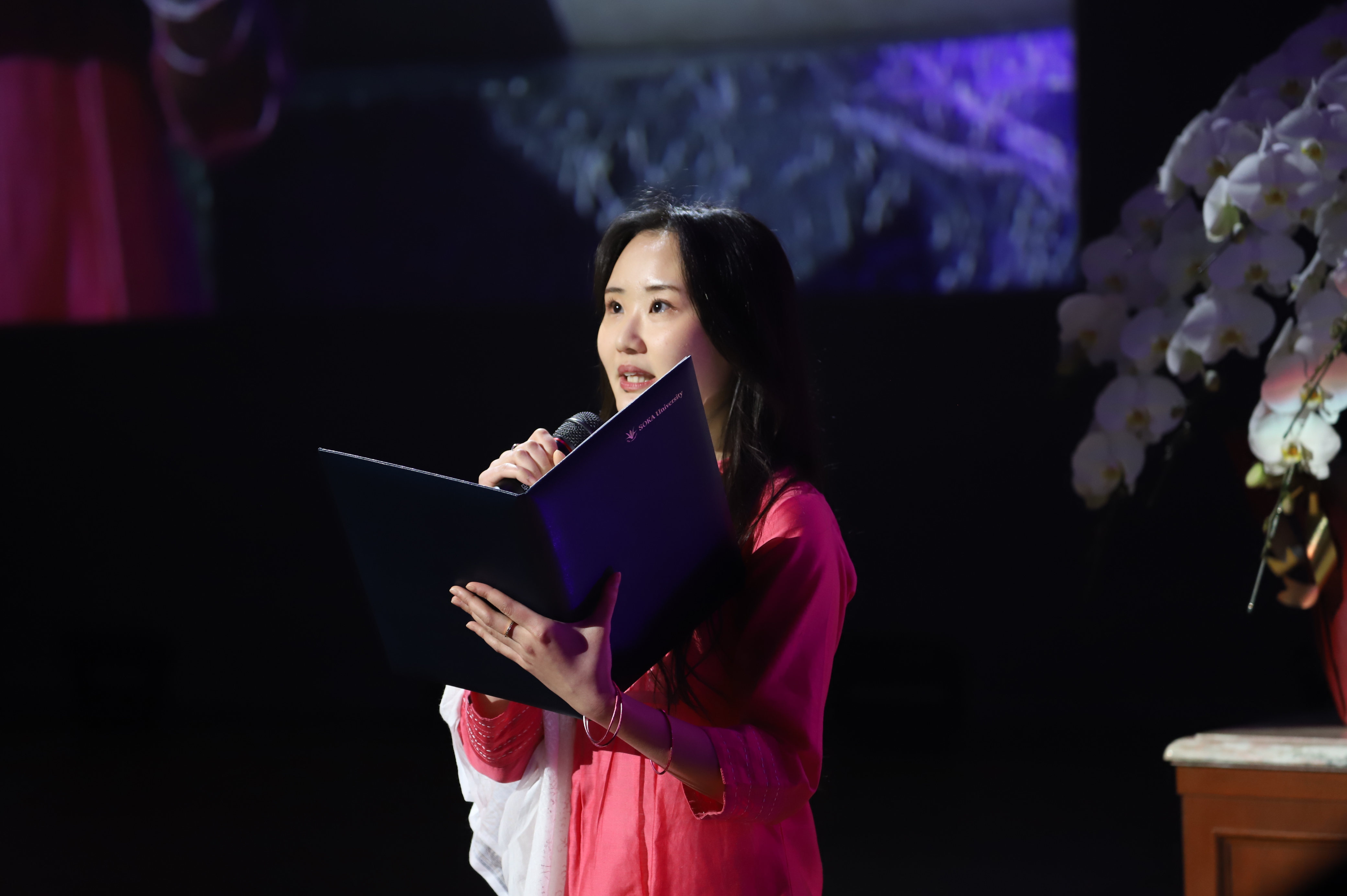 マーチングバンド部「Pride of SOKA」によるファンファーレで式典が開幕。各学部の新入生紹介の後、鈴木美華学長は、勉学や諸活動において失敗を恐れず挑戦することの重要性に言及し、「自身の可能性を引き出してくれる存在、良き友らと語らいながら、勉学・クラブをはじめとする様々なことに挑戦し、唯一無二のキャンパスストーリーを紡いでいってください」と語りました。