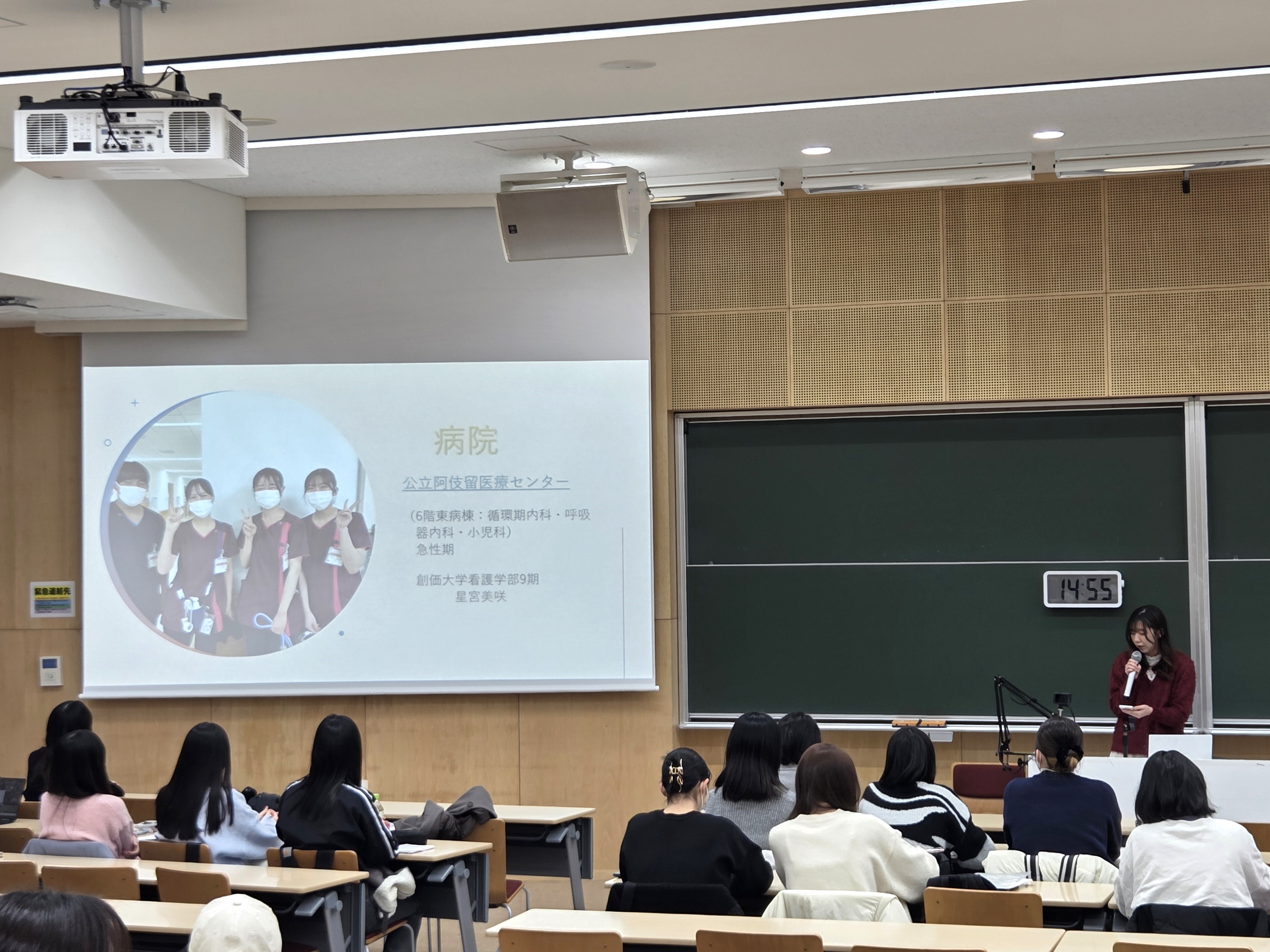 学生が卒業後の自分をより具体的に、そして前向きにイメージできるよう、看護師として現場で活躍する卒業生を招き、「看護とキャリアデザイン」の授業を実施しました。 この授業では、学生一人一人が看護師として、一人の人間として、10年、20年と輝き続けるための「生きる力」を養えるような学びの場を大切にしています。