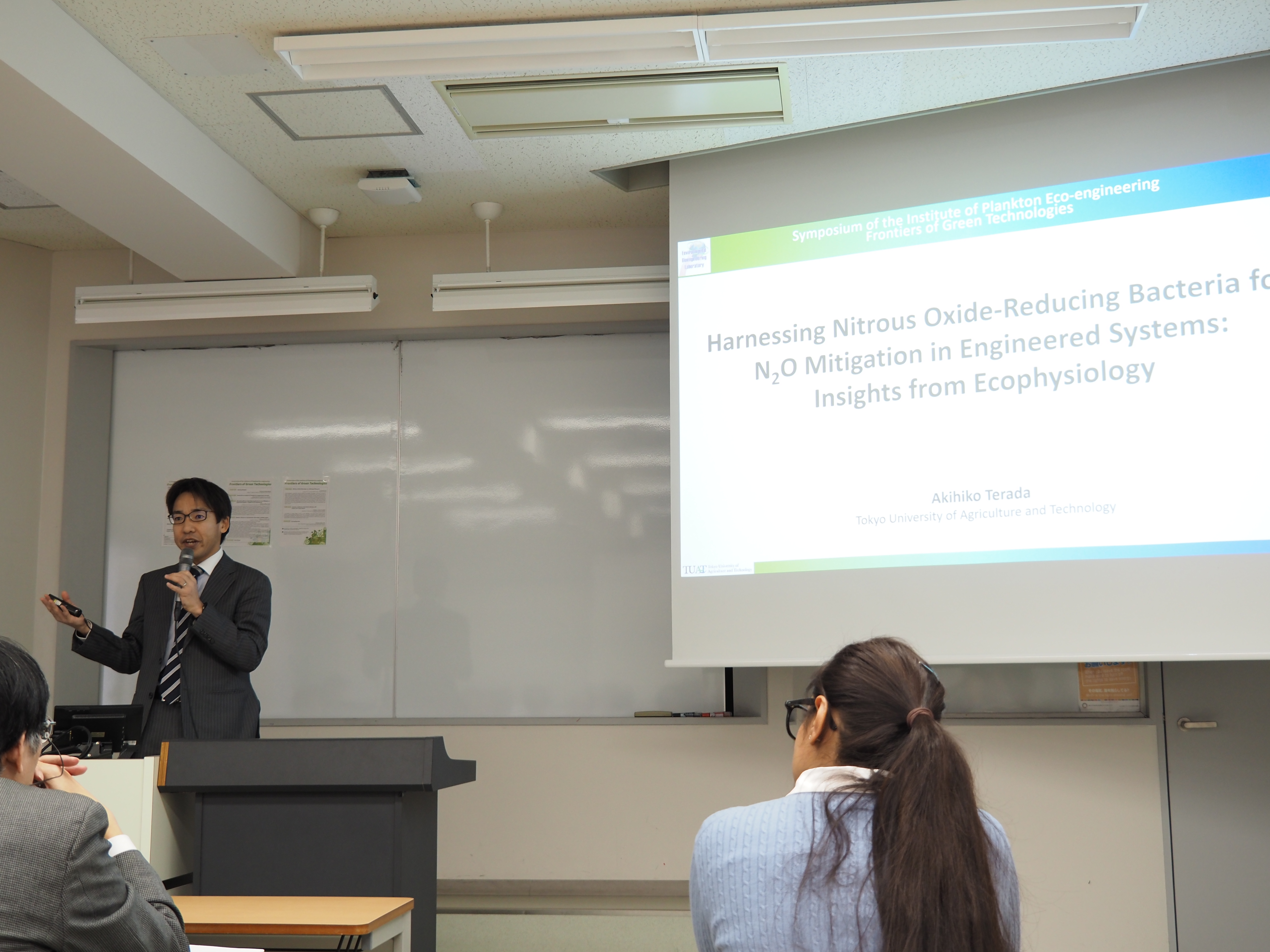 続いて、東京農工大学大学院工学研究院の寺田昭彦教授が、強力な温室効果ガスでありオゾン層破壊物質でもある一酸化二窒素(N₂O)削減に向けたN₂O還元菌の活用研究について講演しました。未開拓菌の単離やその高い環境適応性が示され、温室効果ガス削減技術への応用可能性が報告されました。