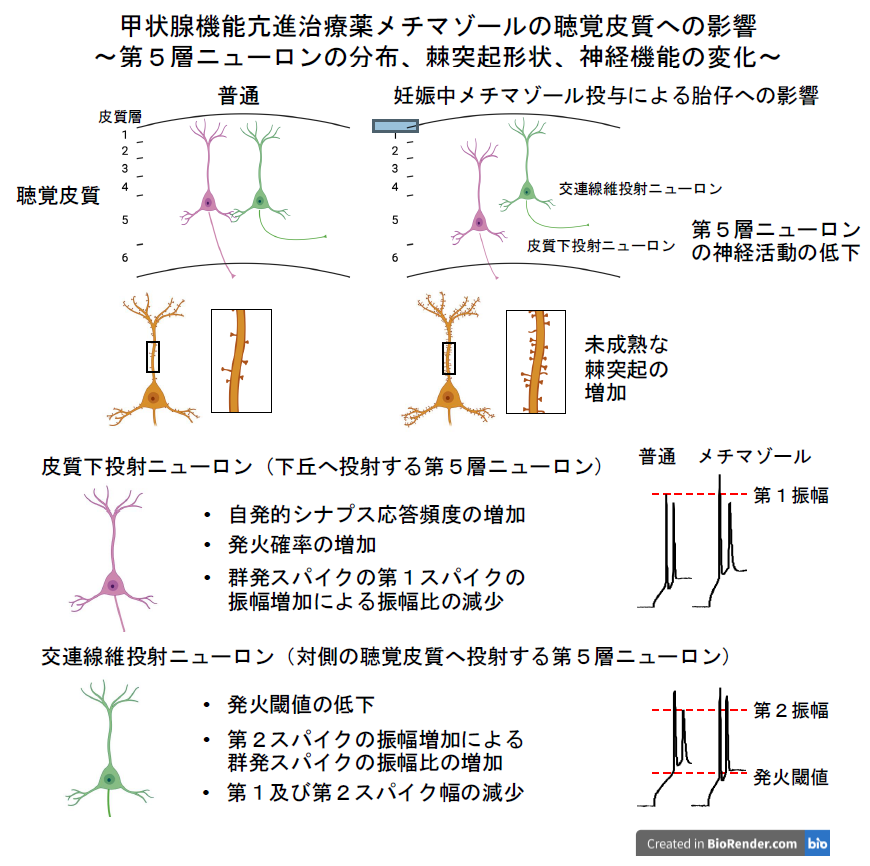 川井研究室の大脳形成研究チームは、マウスにおいて甲状腺ホルモンの血中濃度や聴性脳幹応答が正常な状態においても、メチマゾールが脳形成に影響することを発見しました。特に聴覚皮質において、第5層遠心性ニューロンの異常な皮質内分布や、発達障害でみられる未成熟な棘突起の増加が観察されました。第5層は音の特徴の選択や声などの複雑な音の聴覚学習に重要で、これらを担う皮質下投射ニューロンと交連線維投射ニューロンが存在しています。私たちはこれら2種類の遠心性ニューロンの活動電位において、メチマゾールによるそれぞれ異なる影響を明らかにし、これらを含む第5層神経回路において活性化の低下を見いだしました。これらの研究から妊婦におけるメチマゾールの投与が、胎児の脳形成に直接的に影響を与え発達障害を生じることを示唆しました。