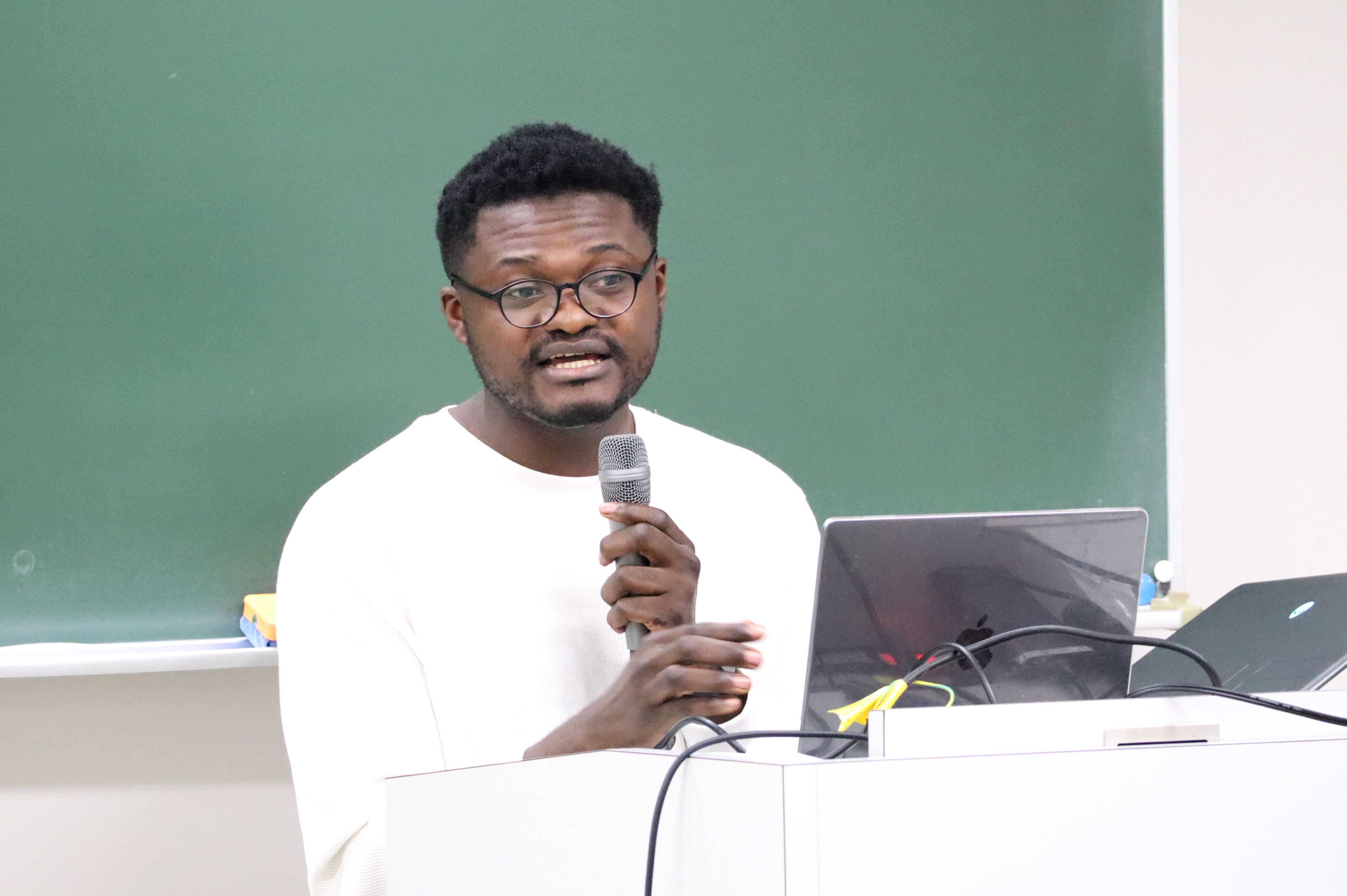 セミナーの第1部では「多分野融合・国際交流コロキウム」を実施。選抜生である荒川秀美さん(理工学研究科博士後期課程)が「データ駆動型解析による疾患糖鎖バイオマーカー候補分子の探索」と題して、Fofou Yonta Tostaniさん(理工学研究科博士後期課程)が「C. elegans キネシンをモデルとした Eg5 の生体内光制御に関する予備的研究」と題して、それぞれの研究成果を発表しました。専門外の参加者にも分かりやすく研究の魅力を伝え、分野を超えた連携の可能性を探りました。