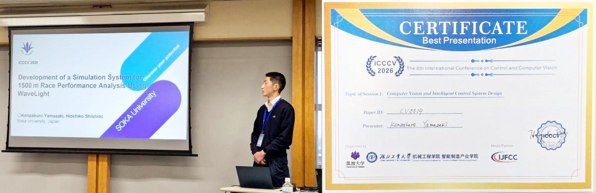 理工学研究科博士前期課程の山﨑賢三朗さん(宍戸研究室)が、つくば国際会議場(茨城県つくば市)にて、2026年4月3日から5日に開催された国際会議 International Conference on Control and Computer Vision(ICCCV2026)において、Best Presentation Awardを受賞しました。