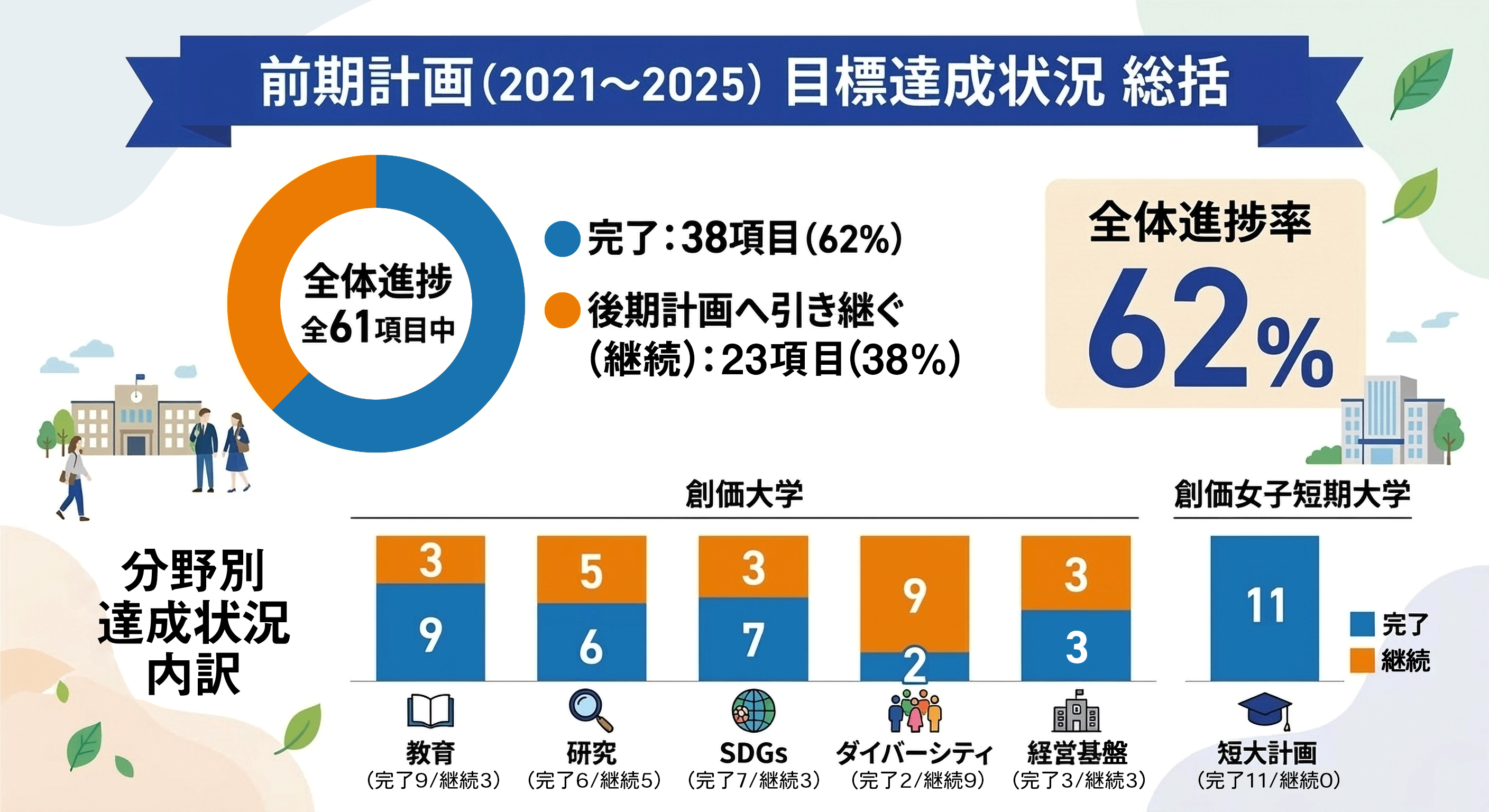 本学は2021年度より中長期計画「Soka University Grand Design 2021-2030」を推進してきました。生成AIの進展やオンライン教育の普及など、大学を取り巻く環境は激変しています。これらの社会の変化に的確に対応し、基本方針を具現化するため、前半5年間の総括を経て「後期計画(2026-2030)」をアップデートしました。