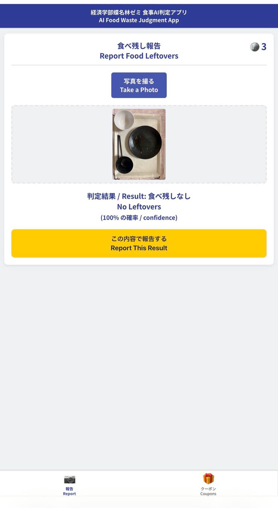 利用者がスマートフォンで撮影すると、その場で判定結果が表示され、データは自動的に記録されます。「食べ残しゼロ」と判定されるとポイントが付与され、一定数に達すると小鉢一品や大盛り無料の特典が受けられます。単なる注意喚起ではなく、参加したくなる仕組みを目指しました。