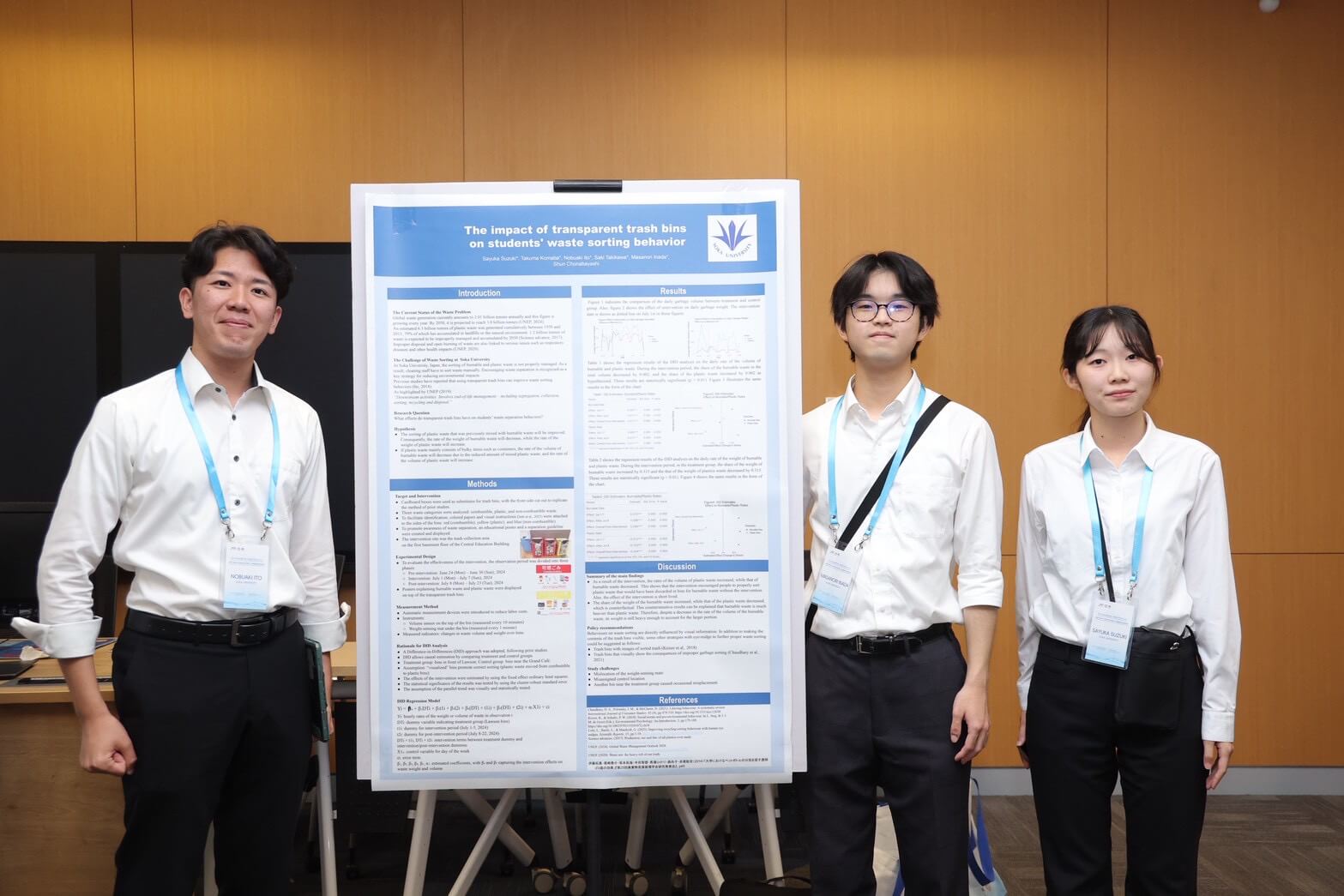 滝川さん:学内のローソン前にあるごみ箱を、自作した透明ごみ箱に置き換えて、正しい分別方法を示す啓発ポスターを掲示し、施策前・施策中・施策後のデータを取得して、学生の行動を統計的に分析しました。プラスチックは軽くてもかさばり、質量だけでは実態を把握できないため、学外業者と連携して計測機器やセンサーを活用しながらデータを収集し、施策を実施していないごみ箱と比較して、DID分析という手法で効果を検証しています。その結果、燃えるごみのかさ量が1.7%減少し、誤った分別が是正されたことが確認できました。