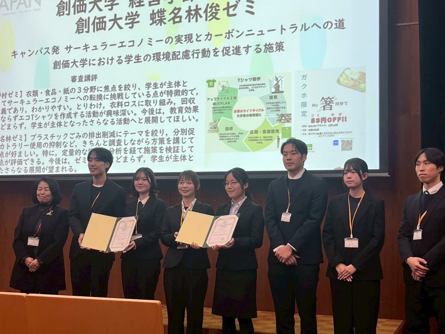 三江さん:創価大学として初の受賞だったこともあり、表彰式に参加したときは誇らしい気持ちでした。一つの施策をやり遂げたという自分たちの努力が大学全体の成果として認められたことは、大きな自信になりました。また表彰式の前日には北海道大学でキャンパスツアーが行われ、他大学からの参加者や教授の方々とご飯を一緒に食べながら、本音で語り合うような時間も設けられ、とてもよい刺激になりました。