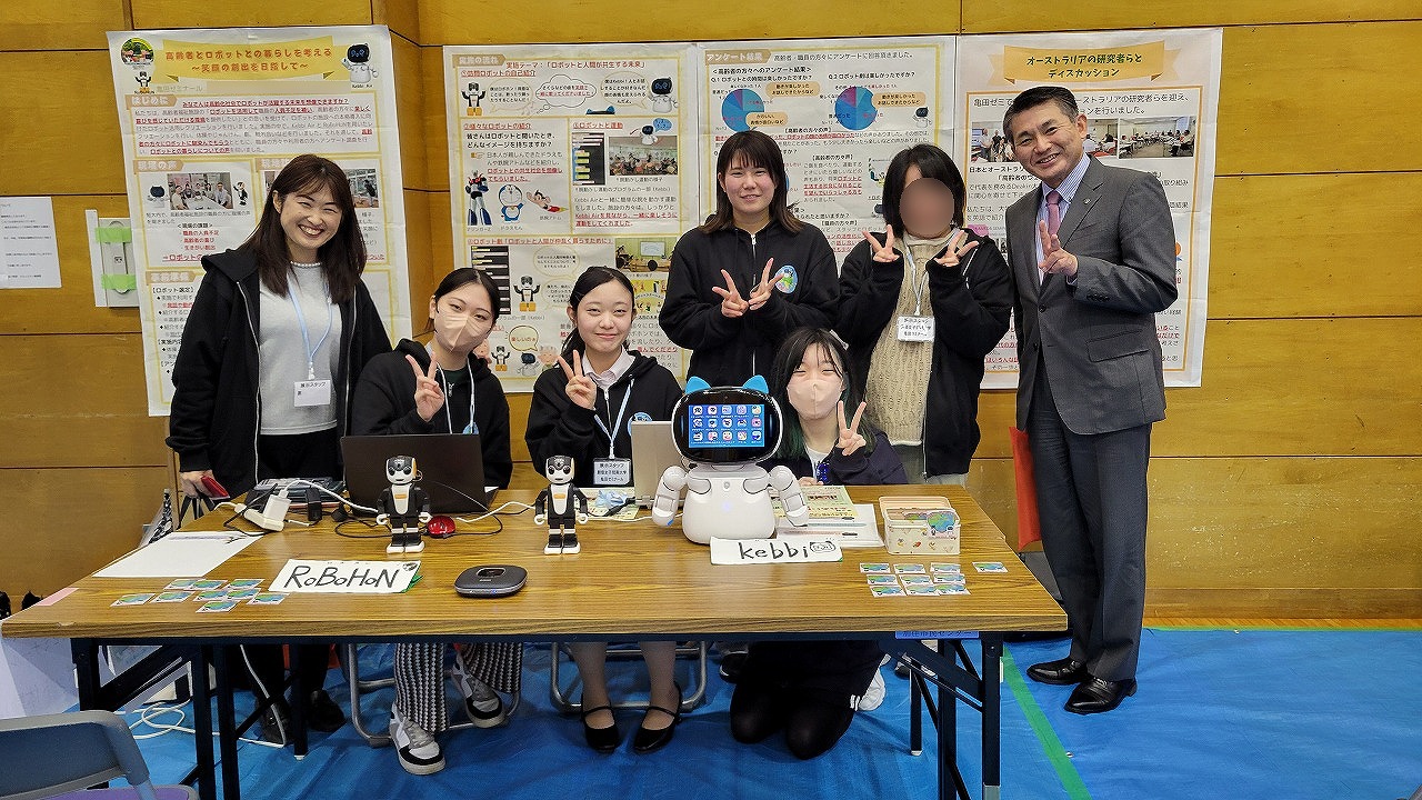 亀田ゼミは、高齢者施設での今年度の実践報告「高齢者とロボットの暮らしを考える〜笑顔の創出を目指して〜」を展示しました。また、コミュニケーションロボットKebbi AirとRoBoHoNとのふれあい体験として、「ロボットとの体操」を体験してもらったり、ロボットの逆立ちやダンスの披露を見ながら会話をしてもらうなど、多くの参加者にロボットとの交流をしていただきました。