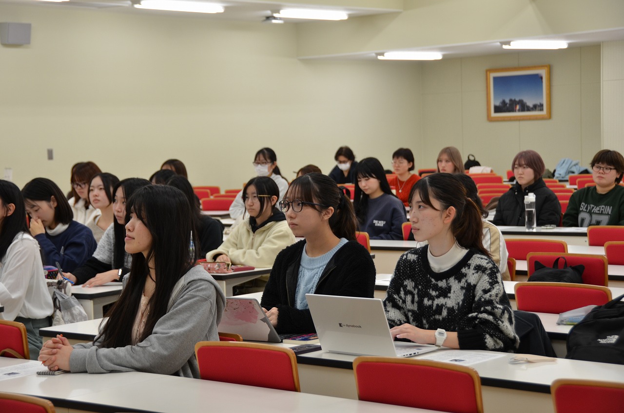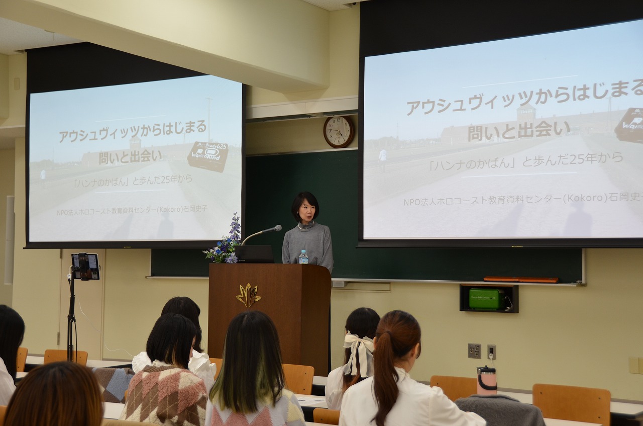 11月26日(水)、本学の「輝く女性育成推進」が企画するセミナー(Student Life Supportセミナーと共催)を、200番教室をメイン会場としてオンラインも併用して開催しました。今回は、NPO法人ホロコースト教育資料センター 石岡 史子理事長を講師に迎え、「アウシュヴィッツからはじまる問いと出会い ー「ハンナのかばん」と歩んだ25年からー」とのテーマで講演いただきました。当日は、現役短大生をはじめ短大卒業生等約300名の方が参加しました。