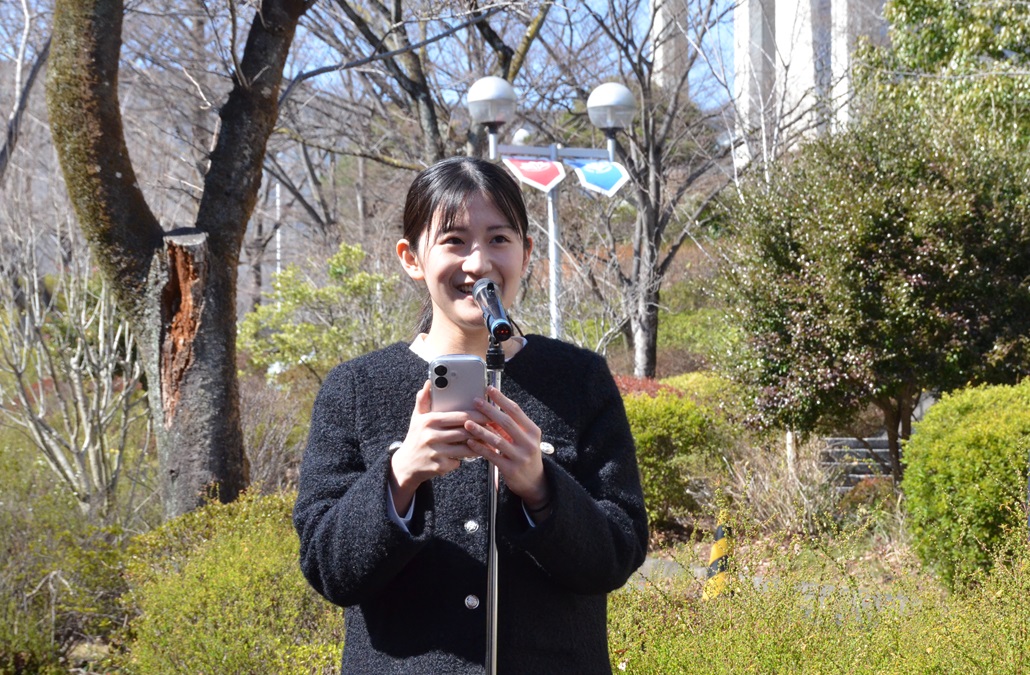 続いて、秋谷理事長が挨拶に立ち、桜を寄贈された学生たちに御礼が述べられた後、植樹することの意義の大きさについて言及。創立者もさまざま場所に記念の植樹をされたことを紹介され、「桜が冬を越えて必ず春に咲くように、どんな困難も必ず乗り越えられる。壁にぶつかったときには、いつでもこの桜を見に母校に戻ってきて、原点を思い出してほしい」とエールを送りました。