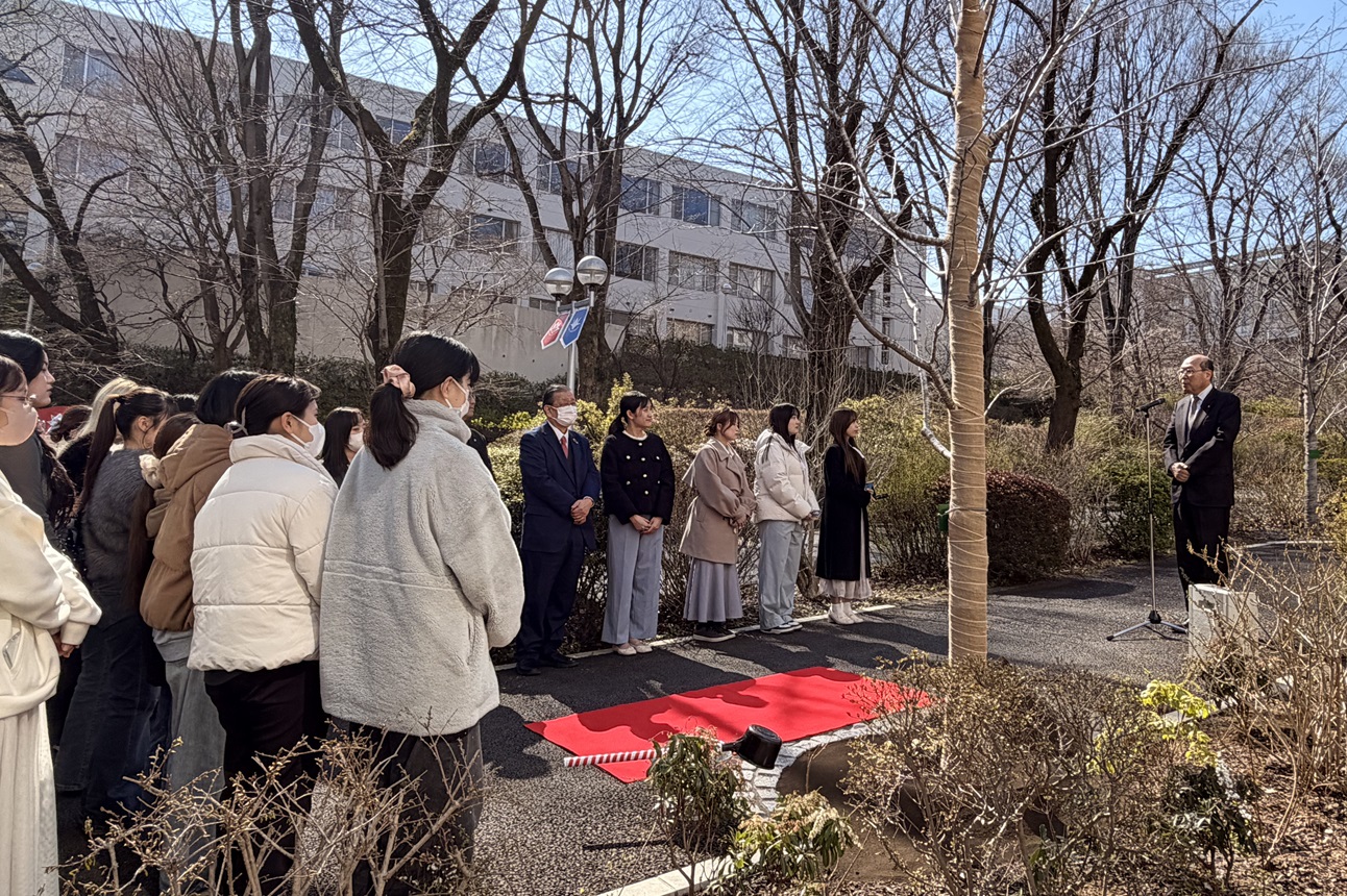 3月12日(木)、本学キャンパス内にある桜花の道にて、卒業記念桜の植樹式が行われ、秋谷芳英理事長、水元昇学長、青野健作学生部長、学生約20名が参加しました。
