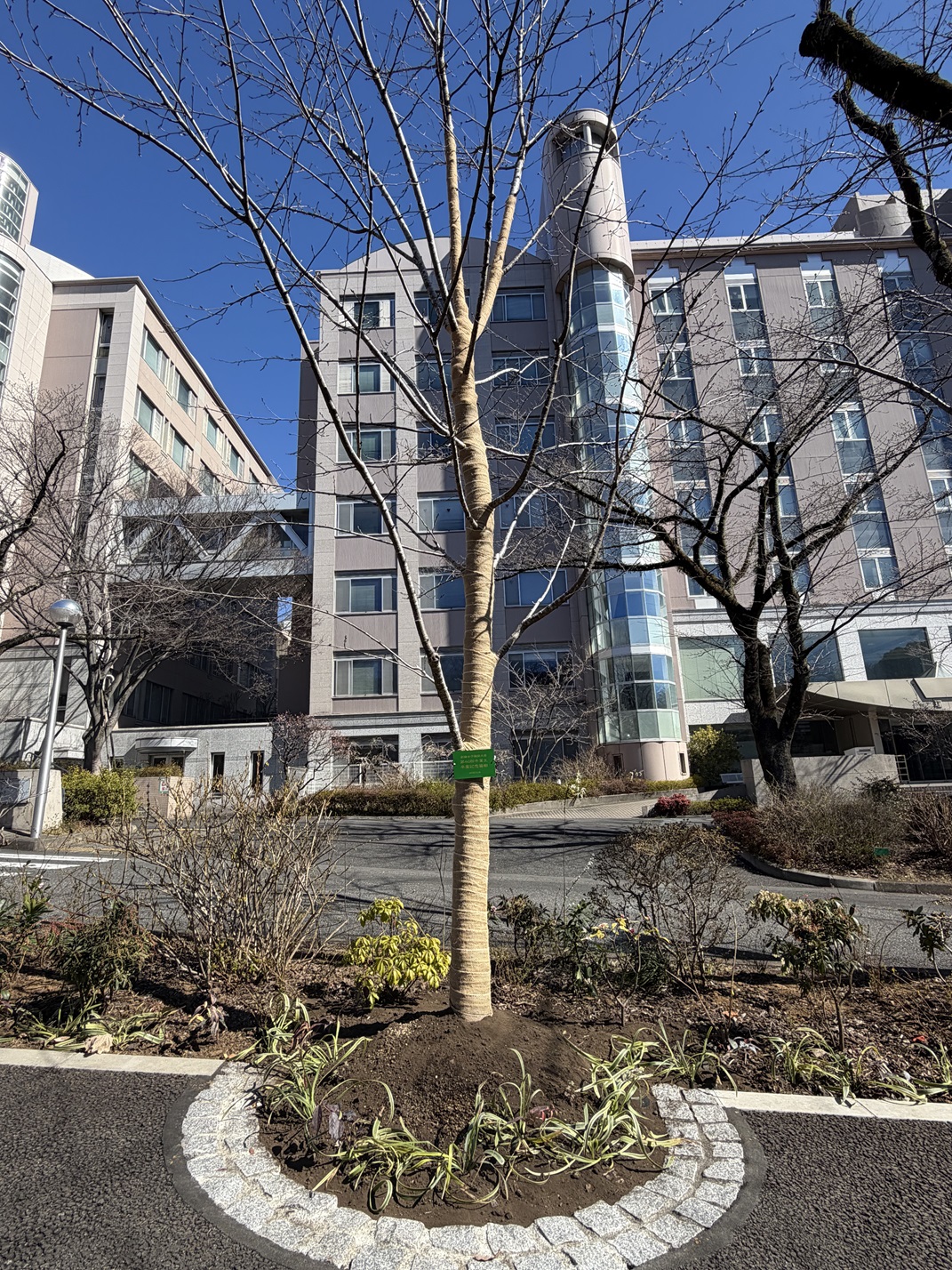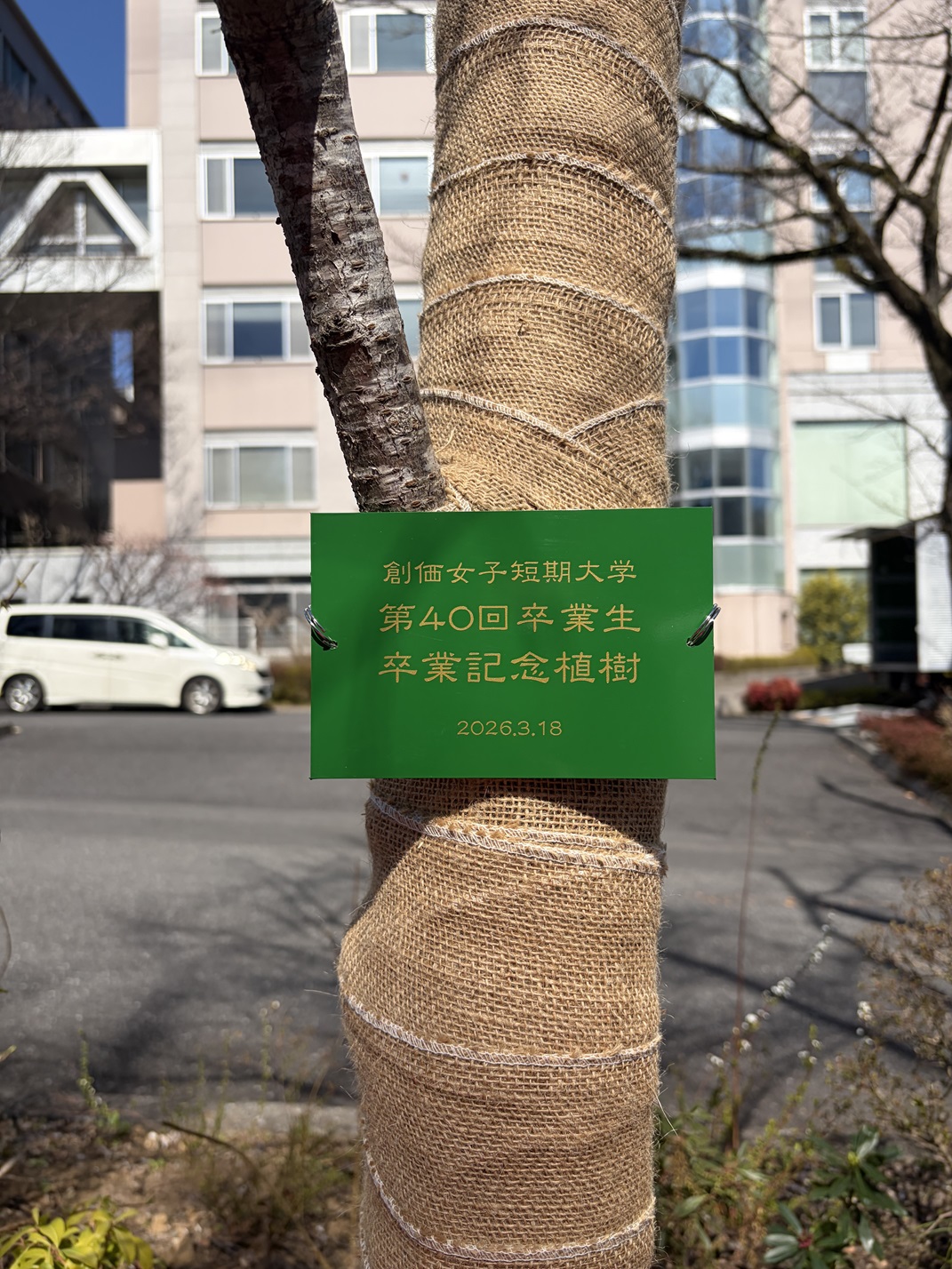 この桜の植樹は、今春卒業する第40回卒業生による大学への寄贈品として実施されたものです。桜の寄贈にあたって学生は、この桜が短大で過ごした誉れの青春二歳を道標として桜とともに自らが成長することを決意するとともに、短大を見守り支援してくださるすべての皆さまと共に 創価の女性教育の原点を胸に刻む場にしていきたいという思いを込めました。