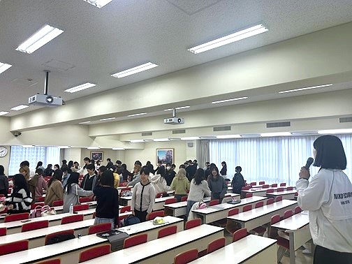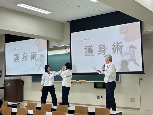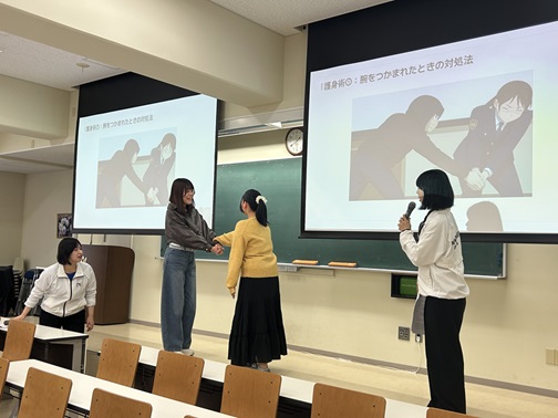講習会では、まず、日常生活の中で身を守るための防犯習慣や行動について学びました。スマートフォンを見ながらの歩行やイヤホン使用時の注意点など、具体的な事例を通して理解を深めました。また、2026年4月1日から導入される自転車の交通違反に関する「青切符制度」について、反則金や違反の種類などを、質疑応答を交えながら確認しました。講習の中で、腕をつかまれた際の対処法など、護身術の実演も行われ、学生は実践的な対応方法を体験しました。さらに、女性の一人暮らしにおける防犯のポイントや、SNS利用時の注意点についても取り上げ、身近な危険への備えについて理解を深めました。