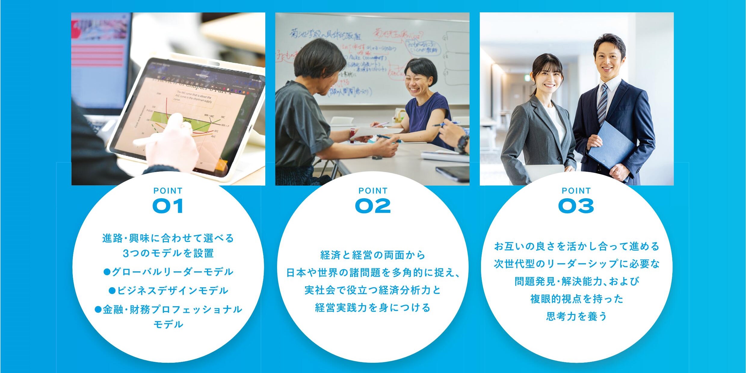 経済と経営、それぞれの学問の枠を越え、相互に補完し合いながら、新しい知の地平を切り拓いていく――私たちはその最前線に立ち、未来を切り開く教育に挑戦していきます。