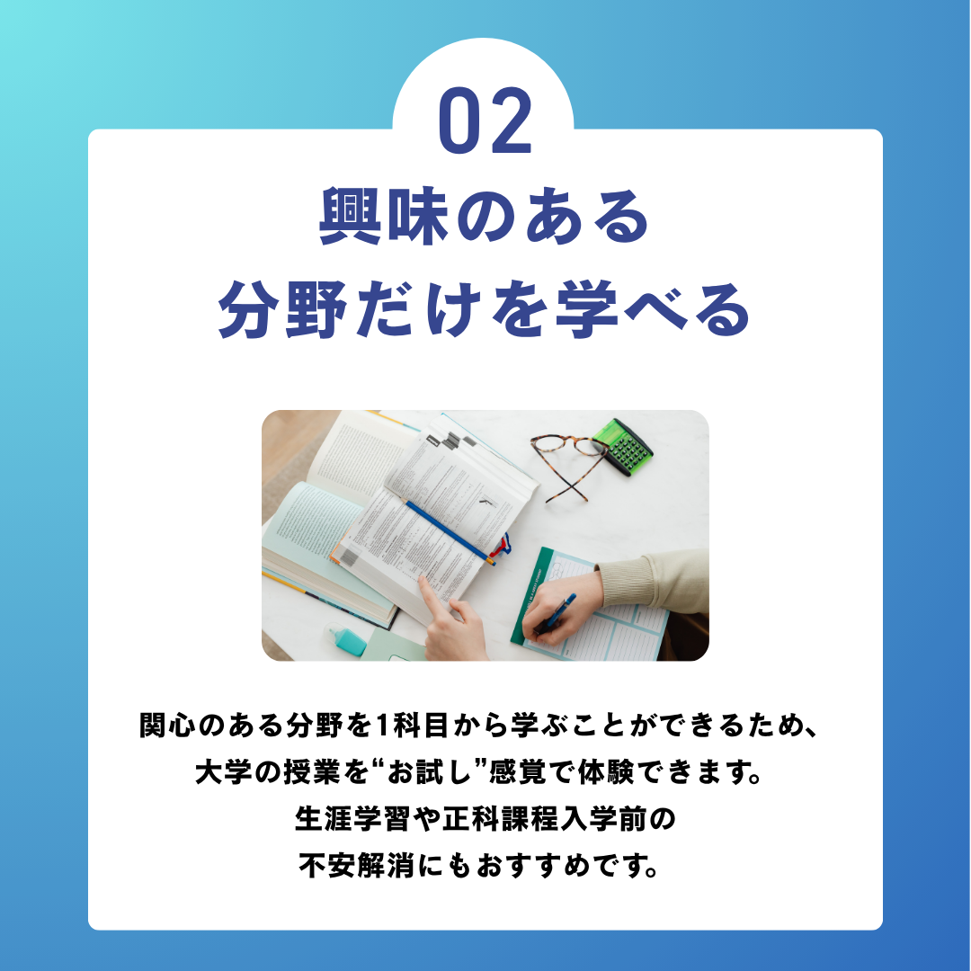 「人生100年時代」において、継続的な学習や成長を重視する「生涯学習」の知識を深め、年齢やキャリアの段階に関係なく学び続けるためのスキルを習得することができます。翌年度以降、正科生として学びたい方におすすめです。