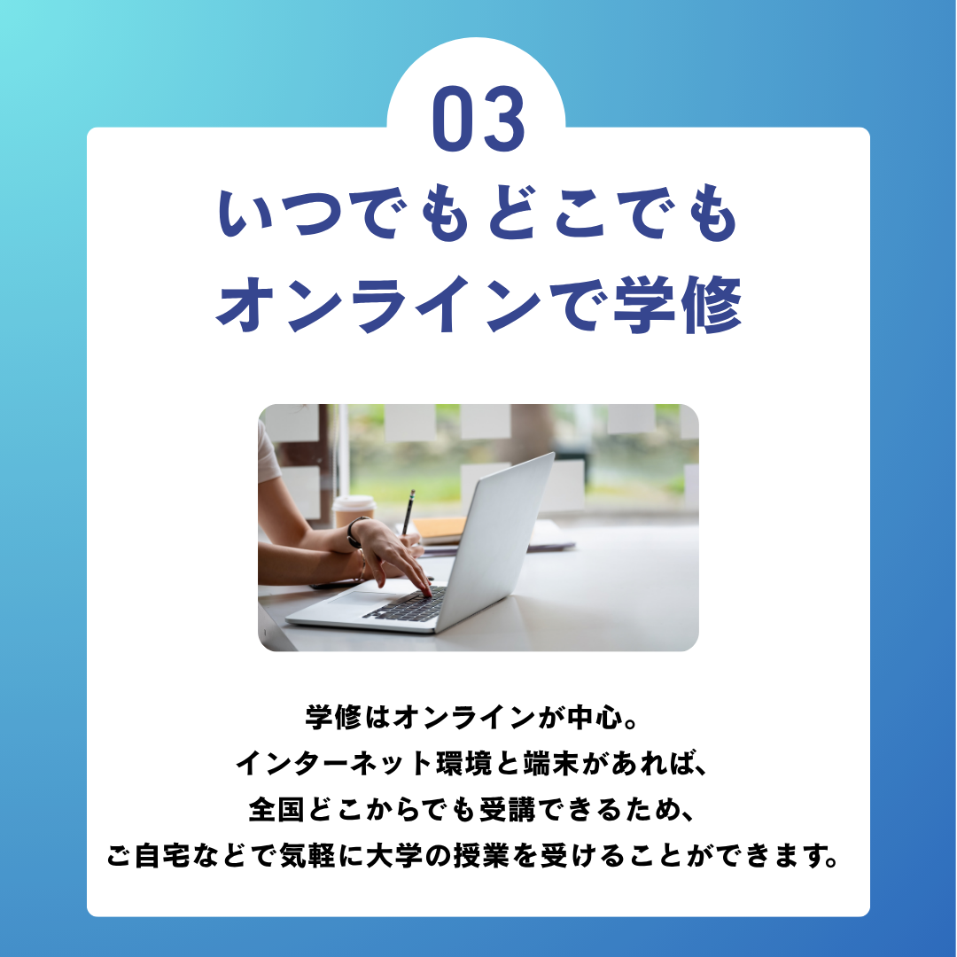 通信教育部で開講している共通科目と専門科目(経済経営学部、法学部、教育学部、文学部)の約250科目の中から、興味のある科目・学びたい科目を選択(1科目から最大30単位まで)し、学ぶことができます。