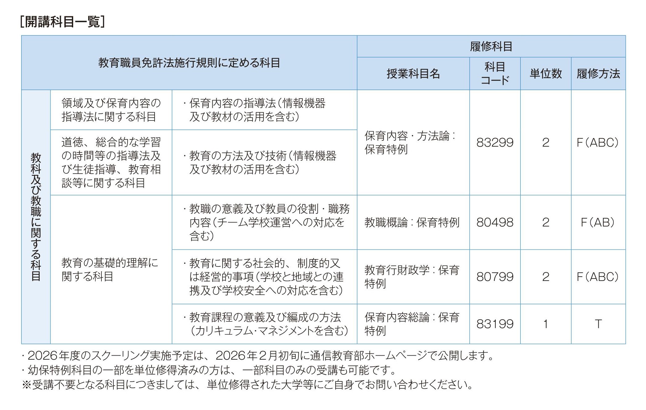 最小の5科目8単位で幼稚園免許取得が可能となるよう、本特例制度に対応する科目を開設しています。