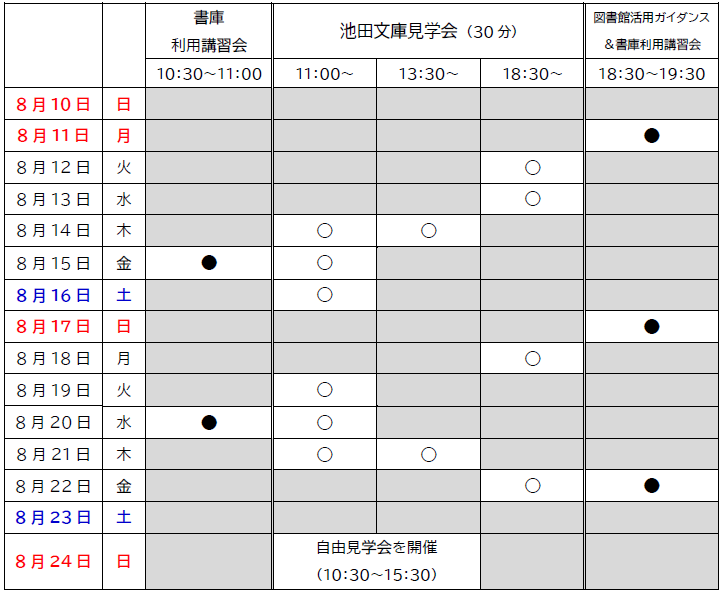 創価大学中央図書館は、夏期スクーリング期間中の月~金曜日は8:30~21:00、土・日曜日は9:00~21:00、最終日(8月24日)は10:00~17:00の開館予定です。